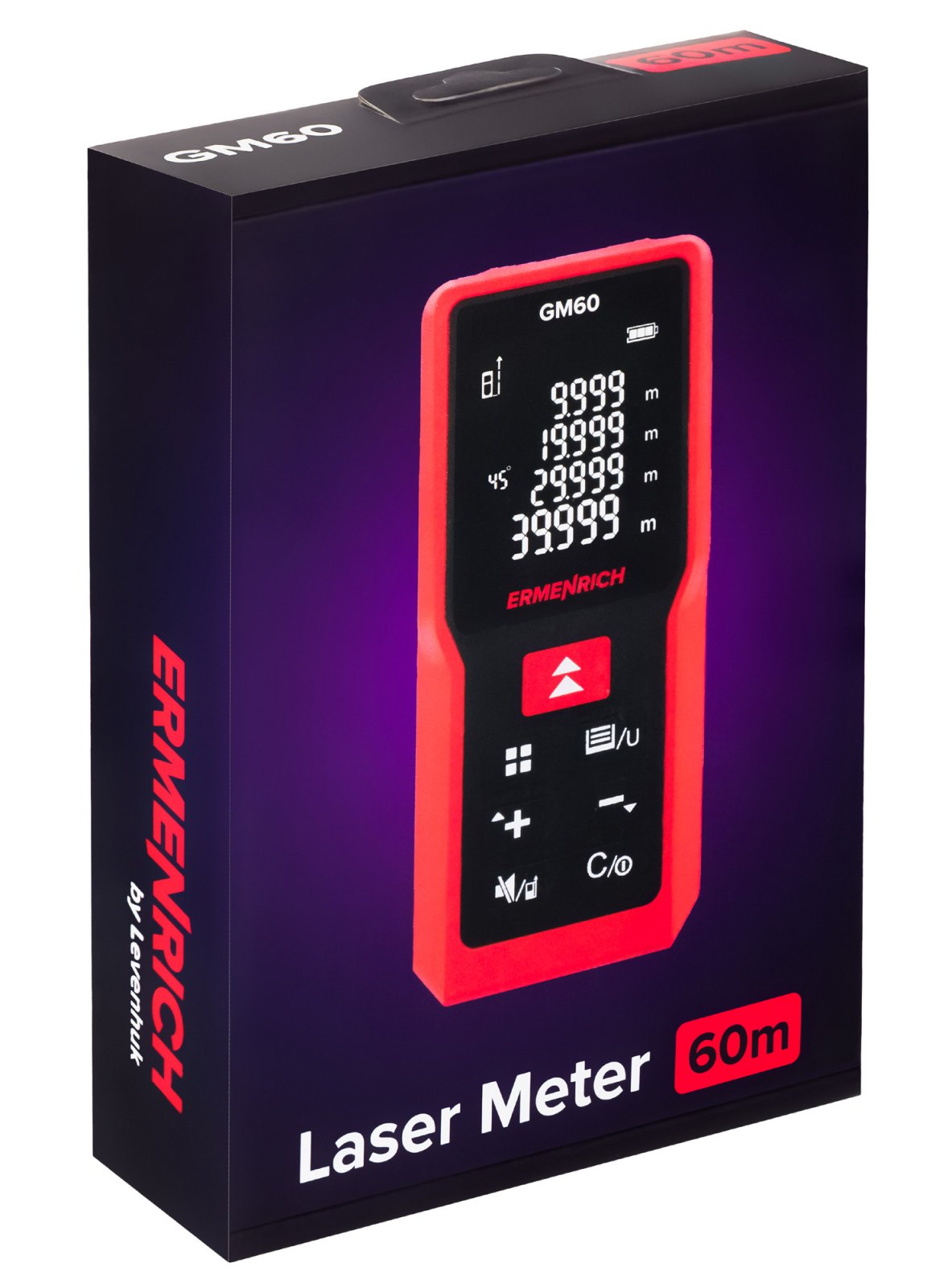 Laserový měřič Ermenrich Reel GM60 je kompaktní univerzální nástroj, který je ideální pro všechny typy inženýrských, stavebních a renovačních prací. Dokáže měřit nejen vzdálenosti a délky objektů do 60 metrů, ale také další parametry, jako jsou úhly, plocha a objem. Jednou z užitečných funkcí je funkce Pythagorovy věty. Provádí nepřímá měření tak, že vypočítá požadovanou hodnotu na základě dvou mezilehlých měření. Jedná se o skvělou metodu měření v případech, kdy není možné zasáhnout přesný cílový bod laserem.