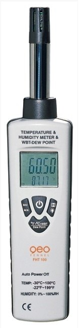 Přístroj Geo Fennel FHT 100 představuje teploměr kombinovaný s vlhkoměrem. Teplotu měří v rozsahu od -30 až do +100°C s přesností +/-0.5°C, vlhkost měří v rozsahu od 0 do 100% relativní vlhkosti vzduchu s přesností +/-2%.