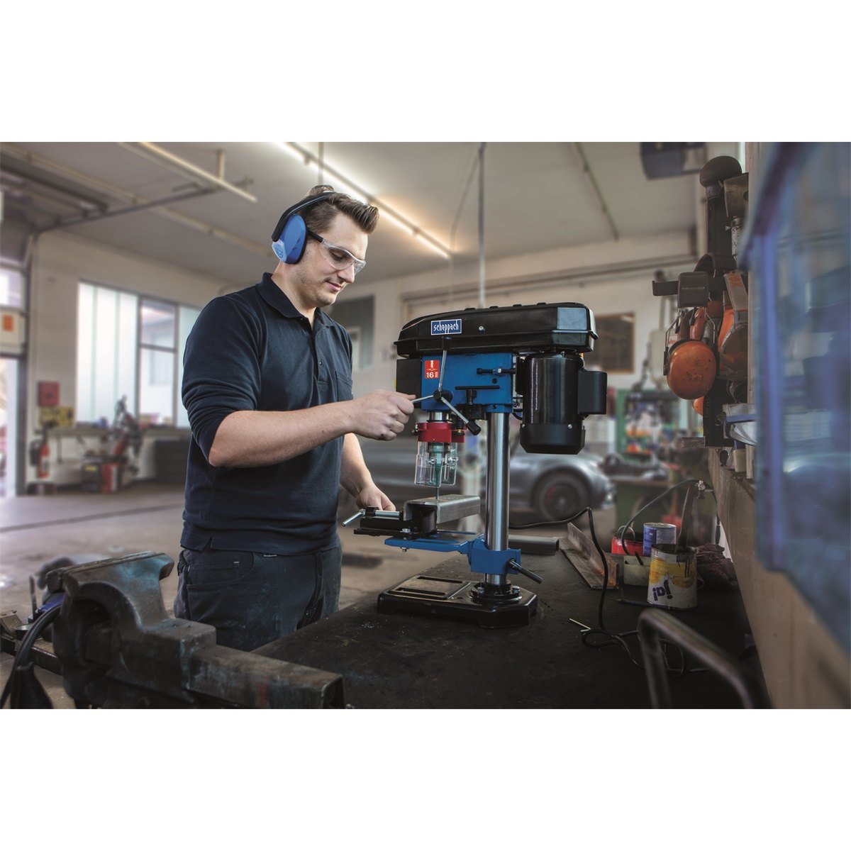 domácí kutily, do malých dílen ap. Zásadní odlišností od běžných strojů v této třídě je křížový laser, který umožní velmi snadnou orientaci při vrtání a urychlí práci při vrtání větších sérií obrobků. Stroj má robustní ocelovou konstrukci, sklíčidlo 16 mm ve standardu, pět stupňů rychlosti pro práci s tvrdým a měkkým dřevem, kovy i plasty, svěrák pro přidržení obrobku na pracovním stole a silný motor 500 W, který si poradí s jakýmkoliv materiálem. Stroj samozřejmě splňuje poslední požadavky evropské unie na bezpečnost, jako je např. hlavní vypínač umístěný na čele stroje, průhledný kryt sklíčidla ap. Stroj je umístěn na stabilním podstavci s možností pevného uchycení šrouby k pracovní desce nebo podlaze.