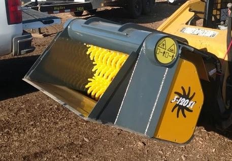 Třídící a míchací lopata GYRU-STAR 3-100SL se třemi rotory. Objem lopaty 230 l. Pracovní šířka 1000 mm, pracovní výška 430 mm. Průtok max. 65 l/min. Hmotnost 360 kg. Doporučená hmotnost smykového nakladače 1000 - 2000 kg.