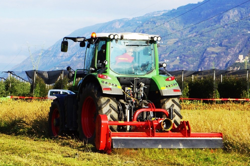Stroj na mulčování trávy a křovin s pevným tříbodovým zavěšením s oboustrannou převodovkou.