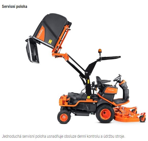 Robustní sekačka trávy Kubota FC3 s 3válcovým dieselovým motorem Kubota. Sběrný koš na trávu s výškou vyprázdnění až 2,05 metru má kapacitu 800 litrů.