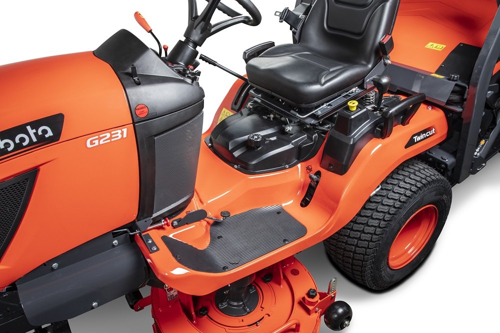 Traktorová sekačka Kubota G231LD s 3válcovým motorem Kubota D902 o výkonu 23,3 HP a 2nožovým sečením 1,22 m s možností sečení mokré trávy do 50 cm. Výhoz do koše 560 l. Hydrostatické řízení, hydrostatická převodovka a uzávěra diferenciálu.