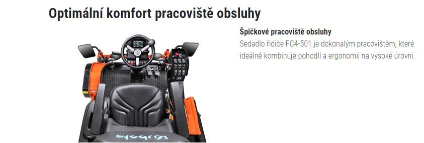 FC4-501 je vlajkovou lodí sekaček Kubota s čelním sečením. Vysoká produktivita a maximálně kvalitní sečení jsou dvě z nejdůležitějších vlastností tohoto stroje. U tohoto špičkového modelu je kladen důraz především na vysoký komfort. Navržen a vyroben tak, aby vám pomohl snadno zvládnout i ty největší pracovní výzvy.