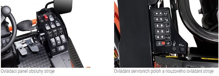 8. Pracoviště obsluhy - Prostorná platforma obsluhy je uložená na silentblocích. Vzduchem odpružená luxusní sedačka řidiče a optimalizovaná konzola loketní opěrky s elektronickým ovládáním nabízí nejvyšší úroveň pohodlí, ergonomie a bezpečnosti.