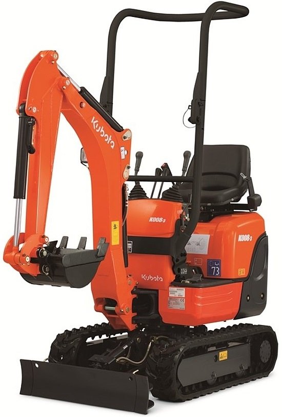 Nejmenší kompaktní minirypadlo z řady KX Kubota K-008, které projede dveřmi. Ideální pro práci v těsných prostorách jako jsou výkopy nebo vnitřky budov. Roztažitelný podvozek. 3 válcový naftový motor Kubota D722-BH-3 o objemu 719 ccm a výkonem 7,4 kW. Hmotnost 980 kg.