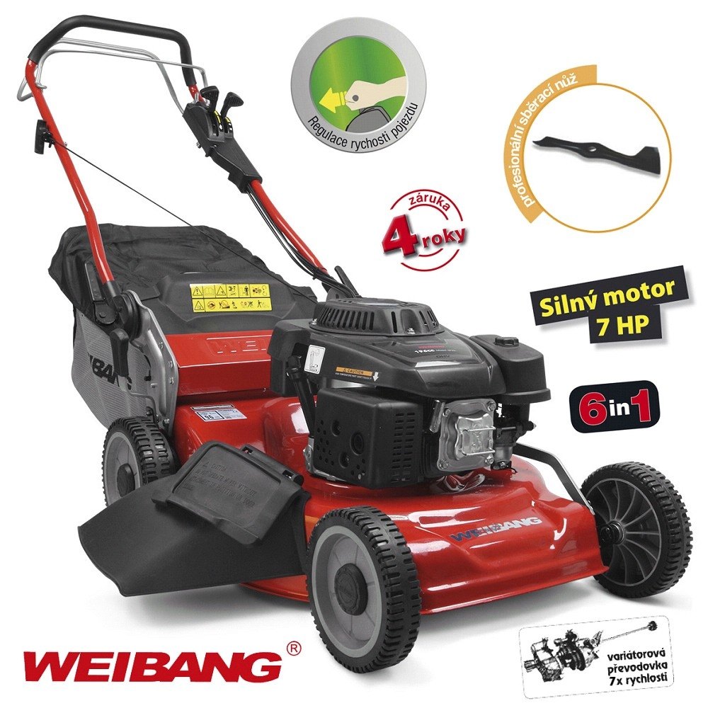 Benzínová sekačka s pojezdem Weibang WB 537 SLCV 6IN1 je vybavena motorem WEIBANG o výkonu 7 HP, šířkou sečení 53 cm a košem o objemu 70 l.