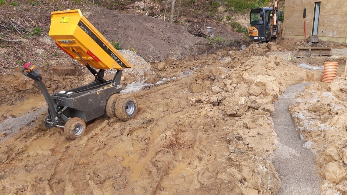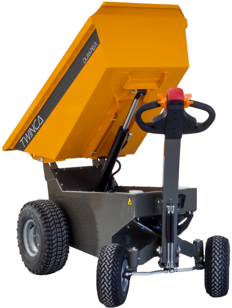 Twinca E-500 je úzký elektricky poháněný minidumper s nosností 500 kg. Se svými rozměry 797 mm na šířku a 1717 mm na délku se E-500 snadno přepravuje a manévruje i v těch nejužších prostorách.