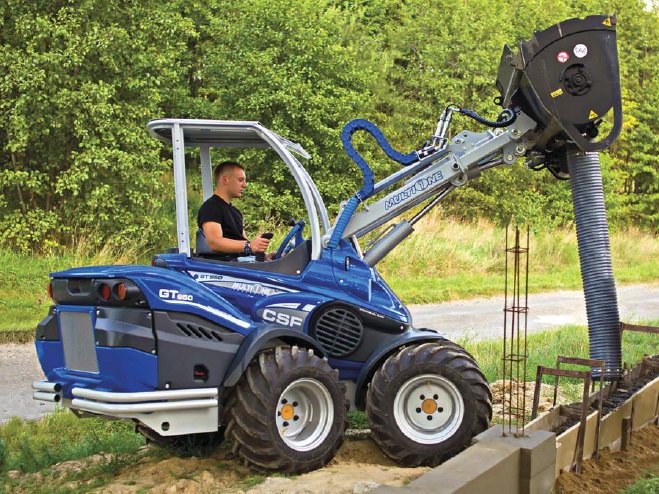Lopata na míchání betonu umožňuje obsluze nakládat, míchat, přepravovat a vykládat beton mnohem rychleji než tradiční stojící míchačka a kolečko. Tato kompaktní velikost jednotky v kombinaci s MultiOne z ní dělá ideálního pomocníka pro zalévání chodníků, příjezdových cest, patek, podlah malých budov a mnoha dalších míst s omezeným přístupem. Lopata se vyprazdňuje ze spodního poklopu. Otevírání poklopu je poháněno hydraulickým válcem ovládaným ze sedadla řidiče. Lopata je také vybavena pružnou vyprazdňovací trubicí, která se montuje na spodní poklop. To umožňuje lití betonu dále a přesněji od lopaty.