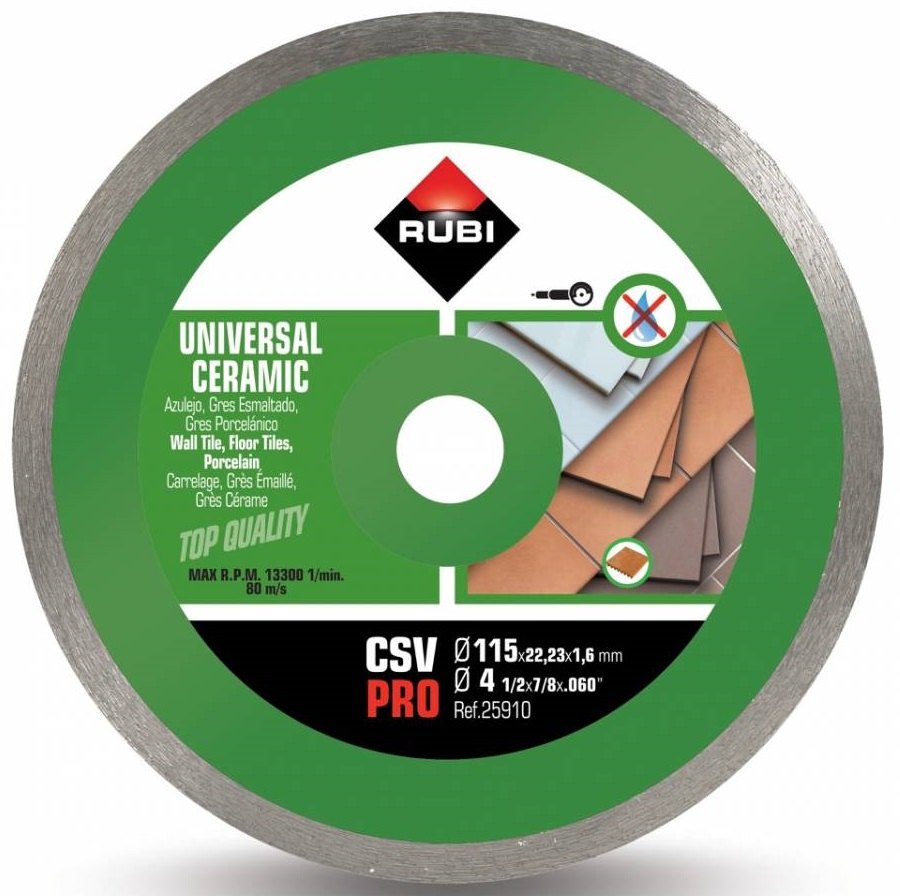 Diamantový kotouč od výrobce Rubi s označením CSV 115 Pro je vhodný pro řezání všech druhů keramických dlažeb. Určen pro řezání za sucha do tvrdých stavebních materiálů.