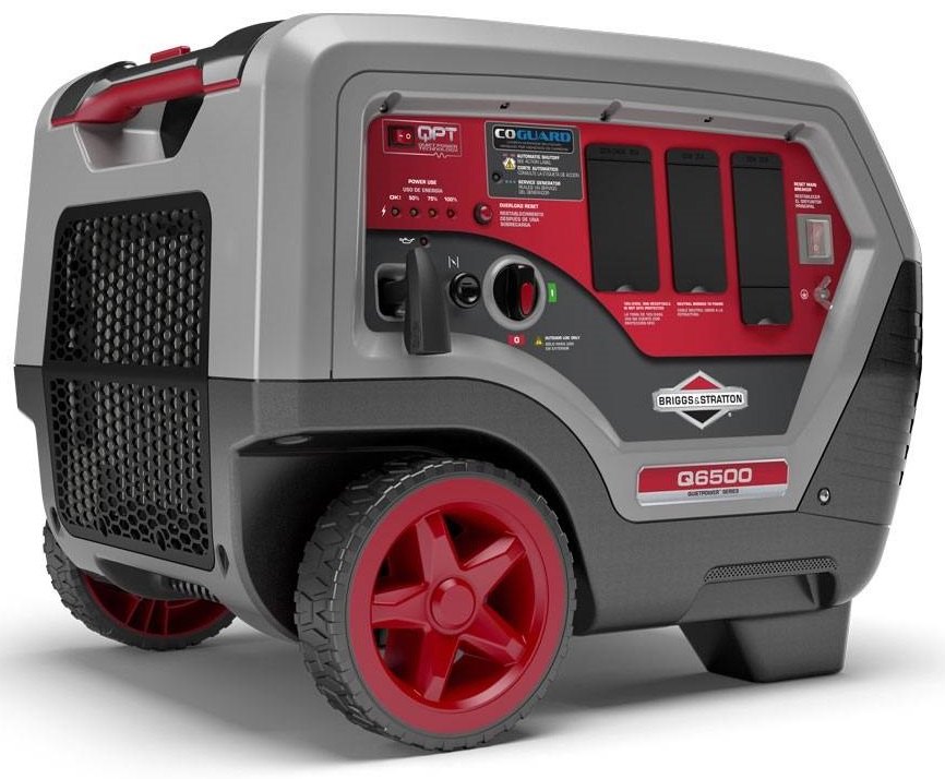 Jednofázová invertorová elektrocentrála BRIGGS&STRATTON Q6500 QuietPower o maximálním výkonu 6,5 kVA, se zdvihovým objemem 306 ccm. Doba porbozu až 14 h. Hmotnost 58 kg.
