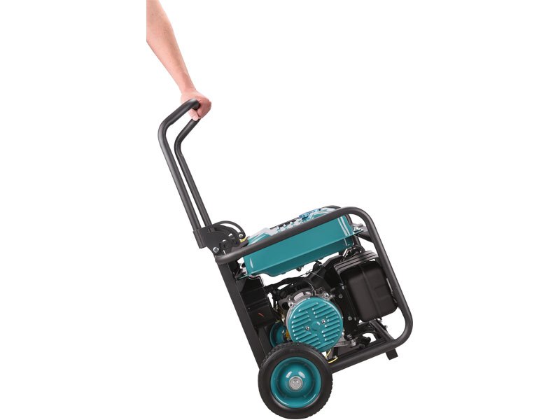 sklopitelné madlo a pevná gumová kola, která jsou součástí dodávky, umožňují snadný převoz elektrocentrály na místo potřeby podobným způsobem jako cestovní zavazadlo s madlem a kolečky