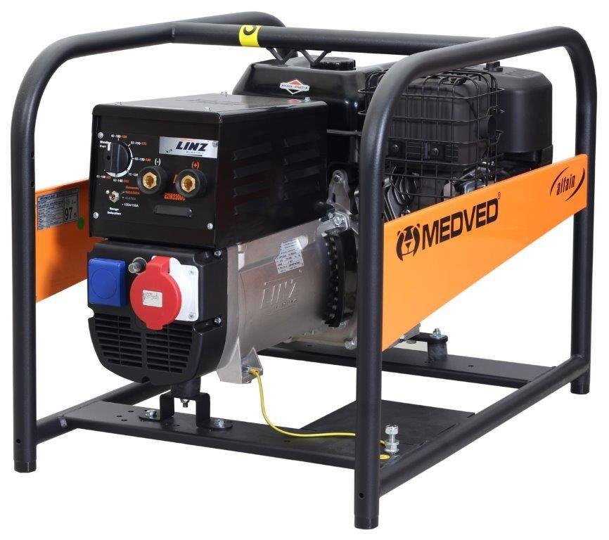Medved WELDVED-DC220 B REG elektrocentrála se svářečkou s maximálním výkonem 6,5 kVA, zdvihovým objemem 420 cm3 a spotřebou paliva 2,1 l/h. Výkon motoru 13 HP. Svářecí napětí DC 21,5 - 28,8. Svářecí proud 40 - 220 A. Hmotnost 91 kg.