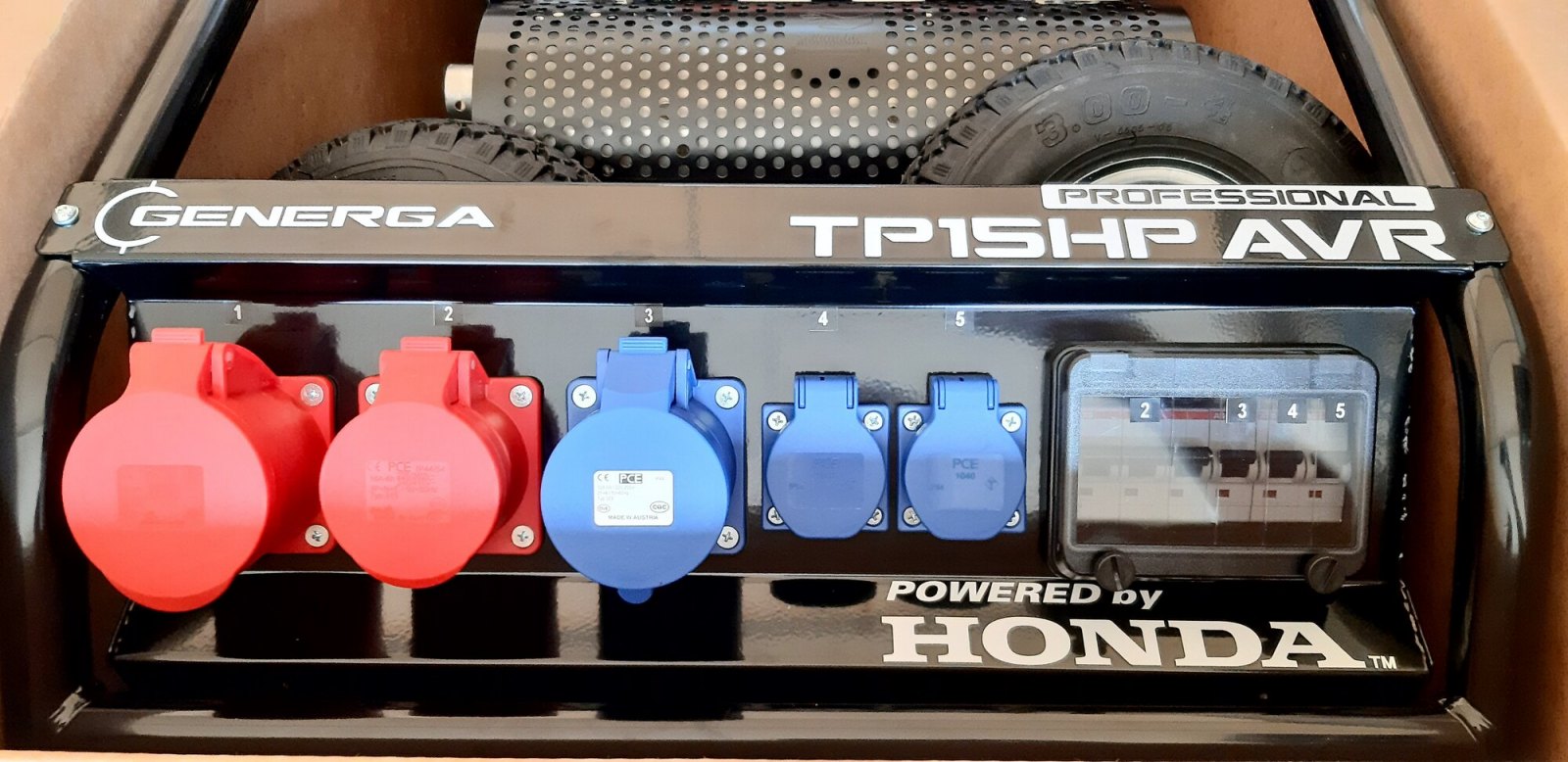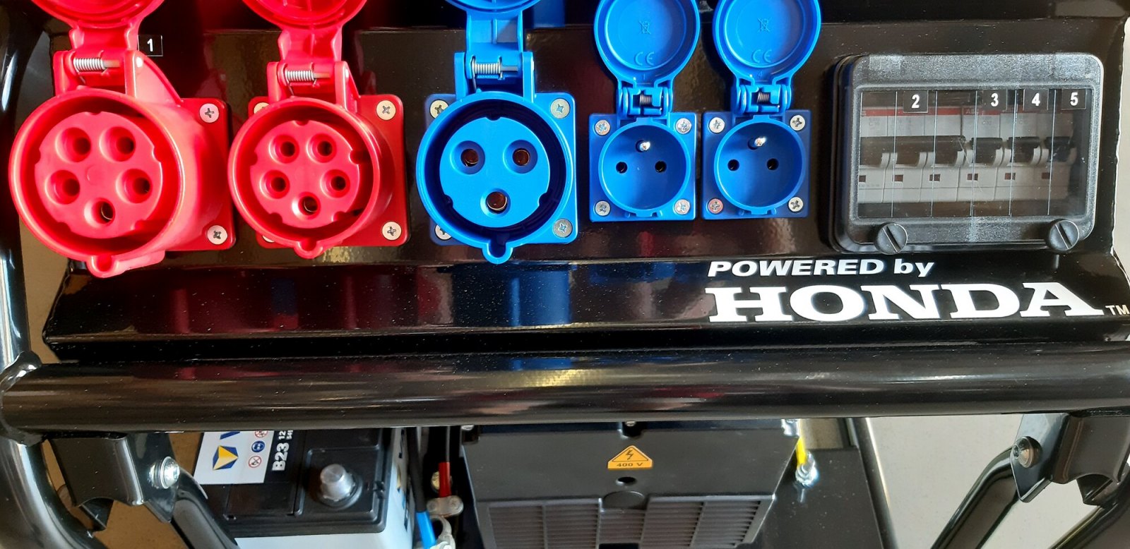 Přepracovaná a vylepšená varianta profesionální rámové elektrocentrály nabízí nový zásuvkový panel s přehledně uspořádanými zásuvkami jak pro odběr 400V/50Hz, tak i pro 230V/50Hz. Panel je navíc opatřen snadno přístupnou a přehlednou pojistnou skříní s jističi pro každou zásuvku. Zásuvkový panel disponuje zásuvkami 1x CEE (32A 400V), 1x CEE (16A 400V), 1x CEE (32A 230V) a 2x CEE (16A 230V). Alternátor je opatřen navíc hlavním vypínačem, umístěným z čela alternátoru hned pod zásuvkovým panelem. Vše přehledné a snadno dosažitelné pro obsluhu.