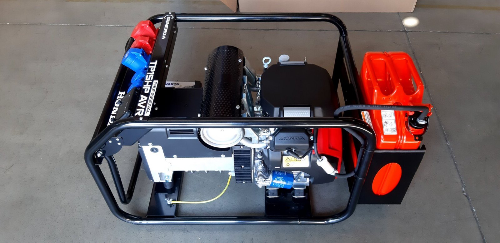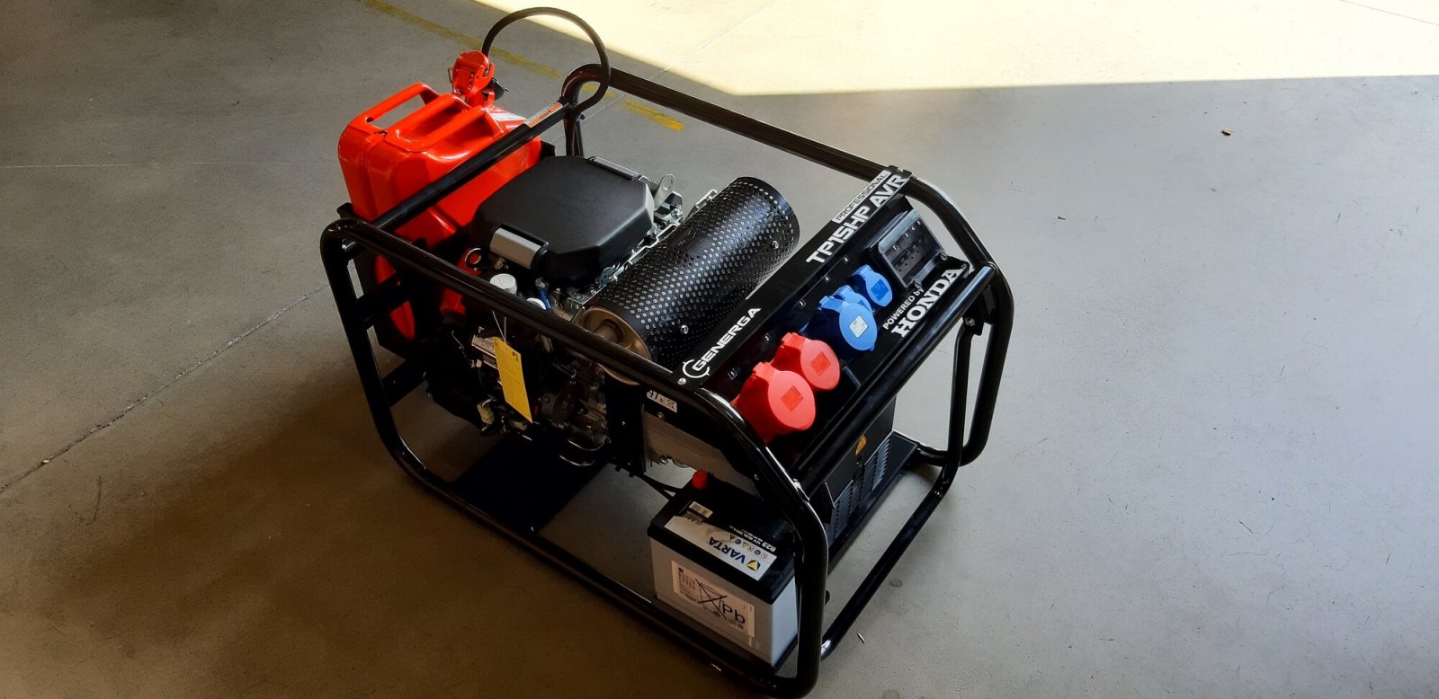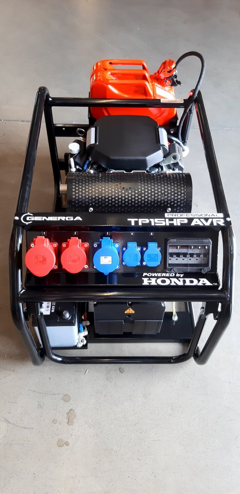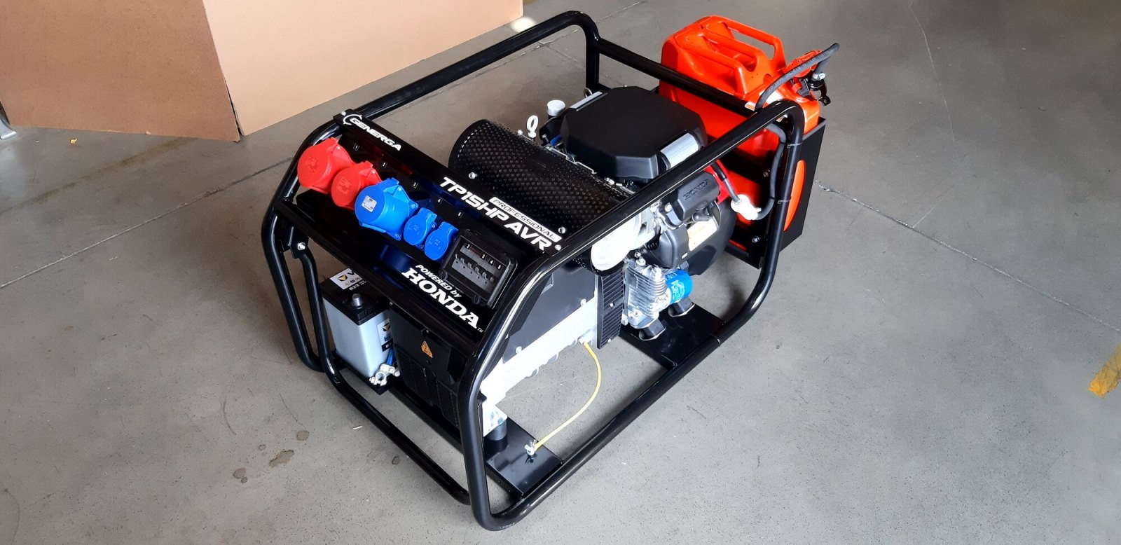 Tato robustní, benzínová elektrocentrála třífázového napětí je svým výkonem 15,0 kVA (3 f.) / 8,0 kVA (1 f.) určena převážně "profíkům" pro napájení celého spektra třífázových elektrospotřebičů i těch, které jsou řízeny elektronikou a je přímo určena převážně řemeslníkům a profesionálům z oblasti stavebnictví a opravárenství. Svým výkonem se hodí do pojízdných autodílen, opravárenských vozů pro práci v terénu nebo na staveniště při zakládání staveb, údržbu silnic a dálnic a pod. Celá soustava je uložena na pružných silentblocích ve vyztuženém rámu, svařeném z ocelových trubek o průměru 30 mm. Ten zajišťuje mimořádnou ochranu soustrojí proti případnému poškození. Jako palivová nádrž slouží standardní 20 l kanystr, uložený v rámu stroje, který lze snadno vyjmout pro případné tankování. Vzhledem ke své hmotnosti je elektrocentrála opatřena transportním kolovým podvozkem. Proto, aby alternátor produkoval napětí 400V / 230V / 50Hz, je motor opatřen automatickým, mechanickým regulátorem otáček tak, aby při jakémkoliv odběru proudy byly otáčky motoru konstantní ve výši 3000 ot./min. Elektrický výkon elektrocentrály v úrovni "15 kilo" vyžaduje "pořádný" a silný, spolehlivý motor. Ten je zde ve formě benzínového vidlicového dvouválce GX690, který patří k nejvýkonnějším pohonným jednotkám na světě v kategorii 26 HP.