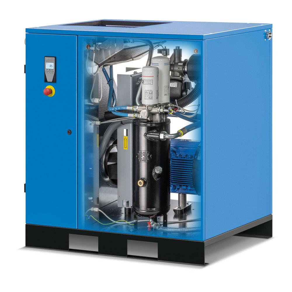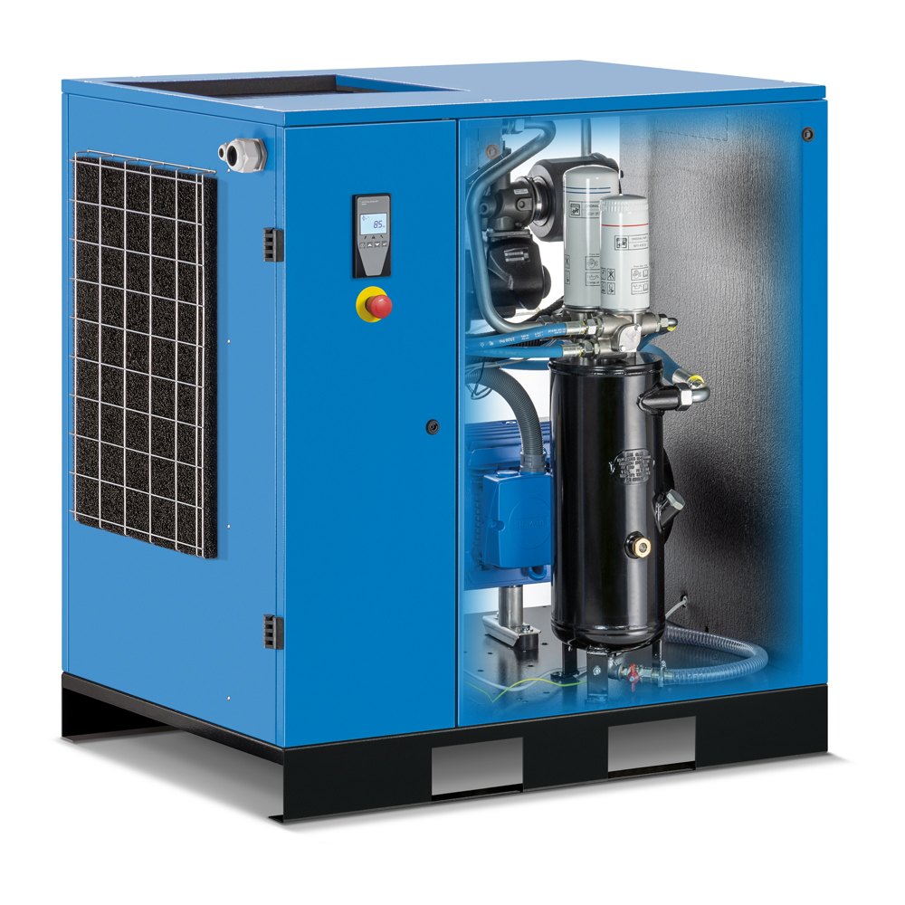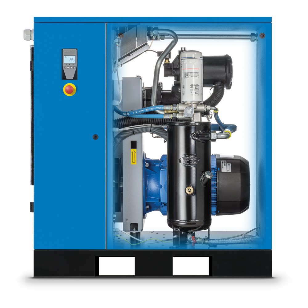 Samostatný šroubový kompresor s převodem pomocí klínových řemenů. Model s příkonem 15 kW a vysoce výkonným šroubovým blokem S67 nabízí výkon 2 215 l/min a následující standardní vybavení: