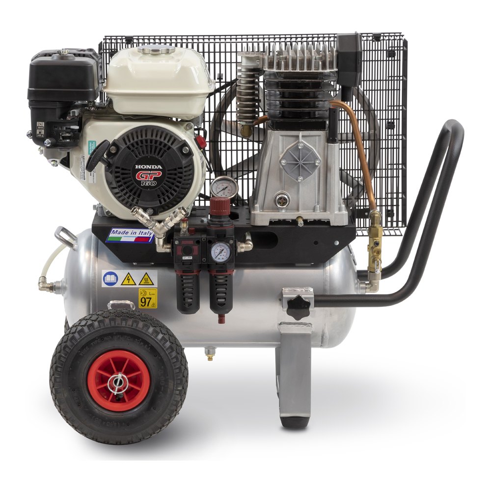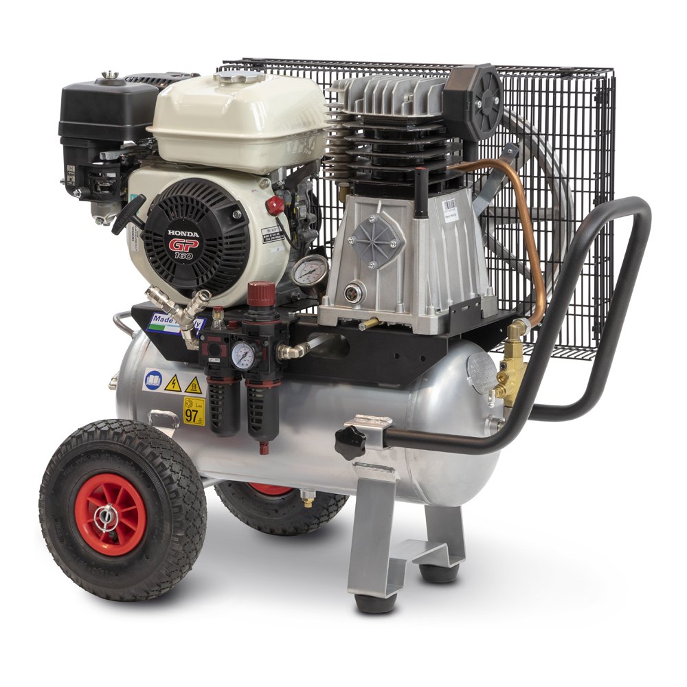 Pístový kompresor s benzínovým motorem s výstupním tlakem 10 bar určený pro nasazení ve stavebnictví, zemědělství a v mobilních službách. Mobilní provedení nezávislé na zdroji elektrické energie s příkonem motoru 3,5 kW a s tlakovou nádobou o objemu 24 litrů.