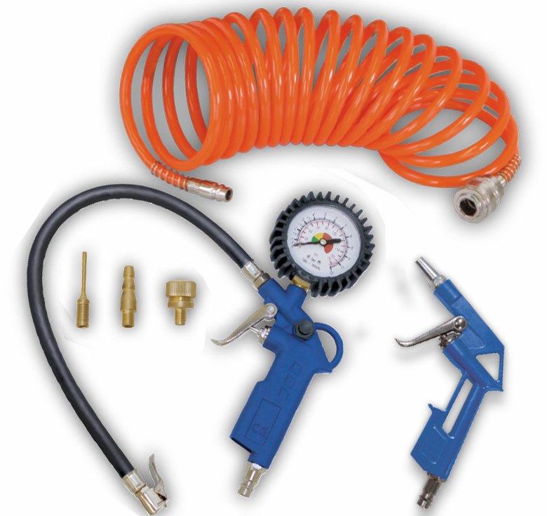 Základní sada příslušenství, která by neměla chybět u žádného kompresoru. Nástroje ze slitin kovů jsou vybaveny rychlospojkami.