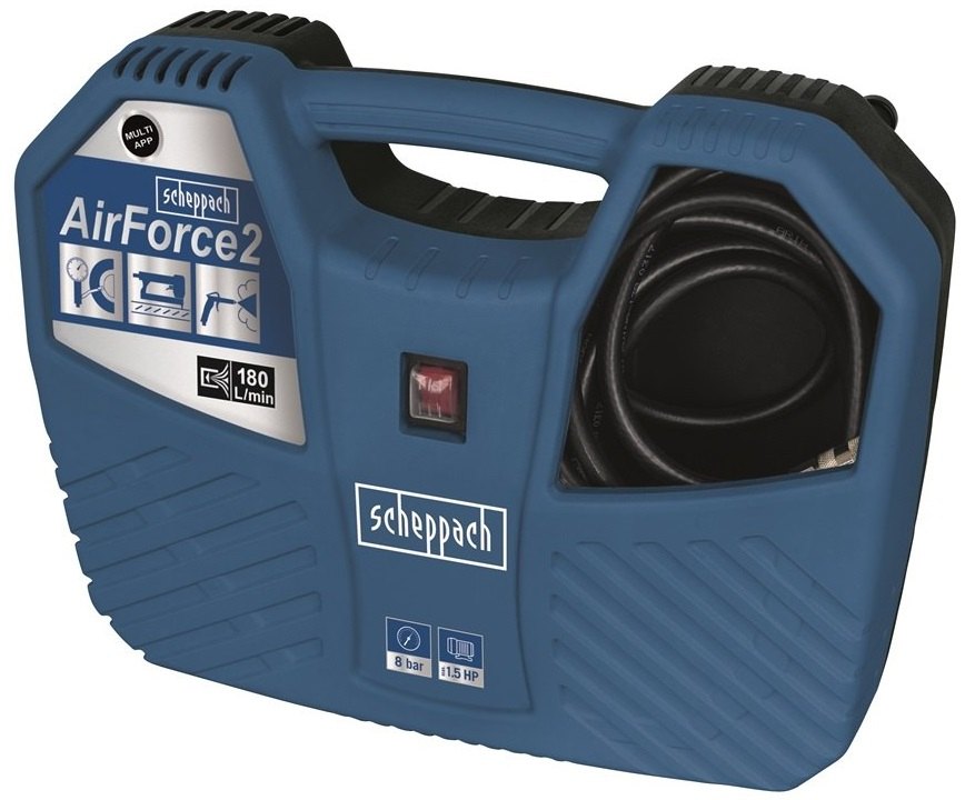 Kompresor Scheppach AIR FORCE 2 je praktický, skladný, lehký, výkonný a bohatě vybavený pomocník vhodný do každé domácnosti, chaty, karavanu nebo lodě. Díky velkému množství různých koncovek, silnému motoru a vysokému pracovnímu tlaku si hravě poradí s foukáním pneumatik motocyklů, kol, aut, terénních čtyřkolek, míčů, matrací, nafukovacích člunů, raftů apod.