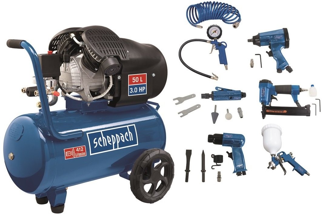 Olejový dvouválcový kompresor 10 bar se vzdušníkem 50 l a příslušenstvím. Dvouválcový kompresor HC 55 DC SET s bohatou sadou pneumatických nástrojů a dalším příslušenstvím je fantastickým řešením pro většinu dílen, servisů, truhlářů nebo i náročných kutilů. Snese dlouhodobé kontinuální zatížení a díky vysokému pracovnímu tlaku a vzdušníku o objemu 50 l je ideální pro použití s téměř jakýmkoliv druhem pneumatických nástrojů. Nezbytným předpokladem pro profesionální použití je dosažení stálého tlaku 10 barů, což je důležité pro dokonalé nastřelení dlouhých hřebů (100 mm), pro sponkování, nýtování, pro uvolňování šroubů u aut, pro stříkací práce ap. Dvouválcový motor má vysoký výkon 3 HP, který zaručuje velice rychlé opětovné natlakování 50ti litrové nádrže. Obecnou a důležitou vlastností dvouválcových motorů je potom jejich delší životnost. Pro mnohé aplikace je nezbytná snadná mobilita stroje. Tento kompresor je i při svých výkonech stále poměrně kompaktní a jeho přepravu usnadňují pojezdová kola a velké madlo.