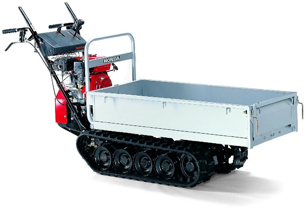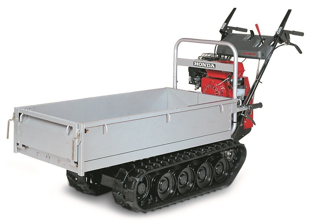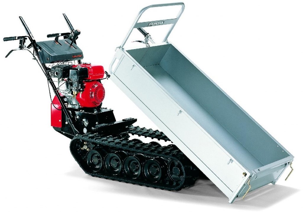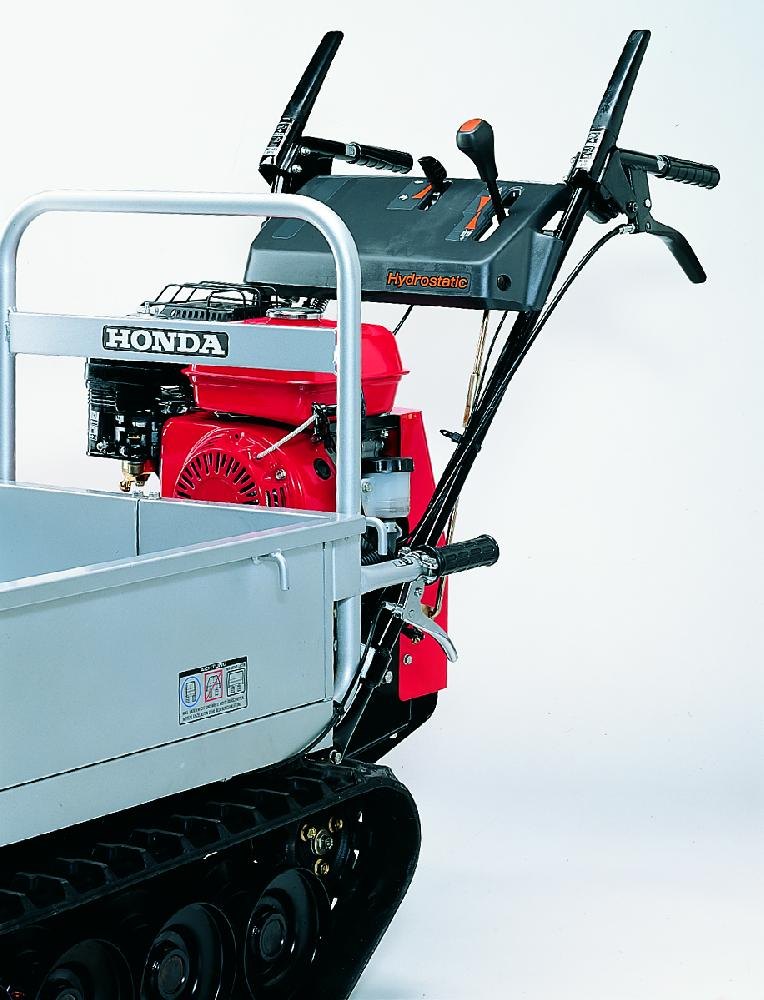 Pásový transportér HP 500 je skutečným "šetřičem" času a namáhavé práce. Je to stroj, který úspěšně zvládne spolehlivý transport těžkého nákladu i v těžkém terénu a v místech s omezeným přístupem bez vynaložení fyzické námahy. Samochodný pásový transportér se pohybuje po povrchu pomocí zesílených gumotextilních pásů, které rovnoměrně rozloží působení hmotnosti stroje na půdu a nedochází k poškození povrchu či zaboření. Pásy jsou šetrné zejména při nutnosti přejezdu po trávnících a v okrasných zahradách. Unikátní vzorek pásů zajišťuje perfektní trakci stroje dokonce i při jízdě do schodů. Každý pás je ovládán nezávisle tzv. rajčáky - páčkami na ovládacích rukojetích, což znatelně usnadňuje manévrování se strojem při jízdě. Díky hydrostatické převodovce pojezdu lze velmi citlivě, plynule a přesně měnit rychlost jízdy vpřed i vzad nezávisle na otáčkách motoru. Obratnost stroje v omezeném prostoru je umožněna i díky velmi malému poloměru zatáčení, který činí pouhých 71 cm. Ovládání směru a rychlosti jízdy stroje je tak velmi snadné, komfortní a zvládne jej i fyzicky méně zdatnější jedinec. Pásový transportér je opatřen výklopnou korbou s výsuvnými bočnicemi, umožňujícími transport i rozměrnějšího nákladu. O pohon se stará spolehlivý a výkonný motor Honda GX 160 výkonové kategorie 5,5 koňských sil. Startování motoru je legendárně snadné a majitel určitě ocení ohromnou sílu motoru. Díky vysoké obratnosti a malé šířce se s transportérem můžete pustit i do vnitřku budov a jinak stísněných prostorů. Využití pásového transportéru je např. v půjčovnách strojů, provozech v zemědělství, u vinařů, lesníků, stavebníků, těžařů, kameníků, železničářů, zahradníků, ale i majitelů zahrad a objektů se svažitým terénem nebo ztíženým přístupem.