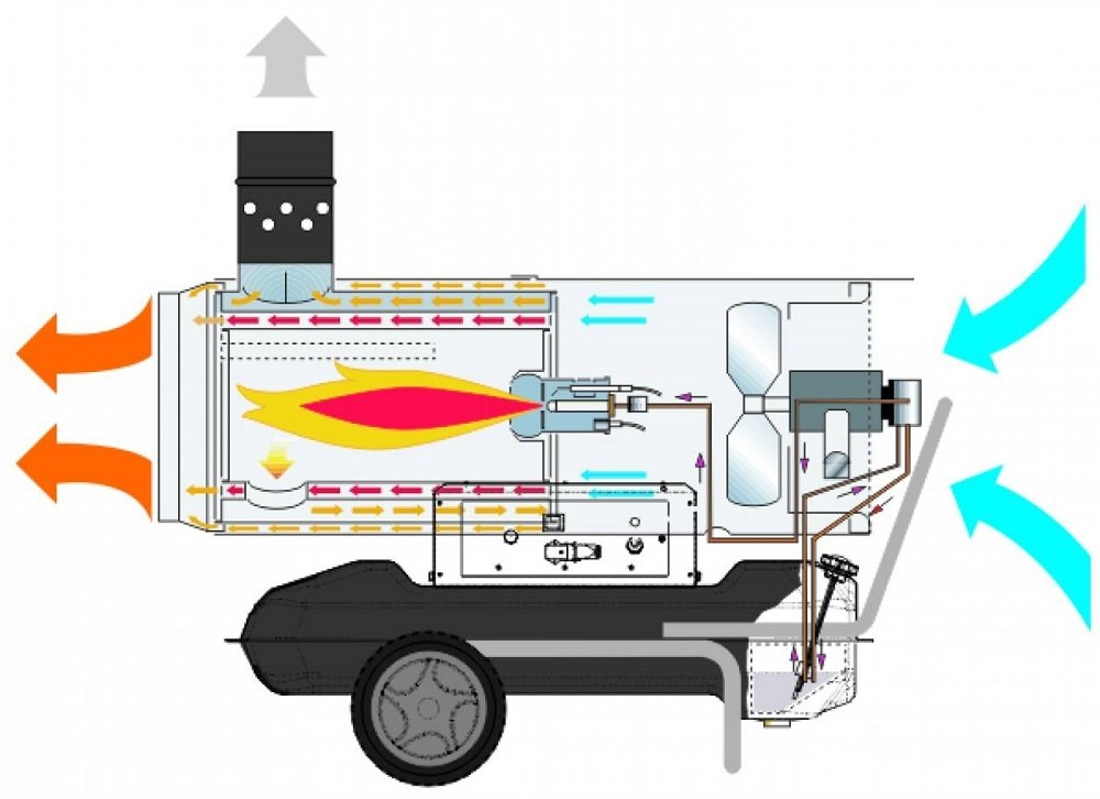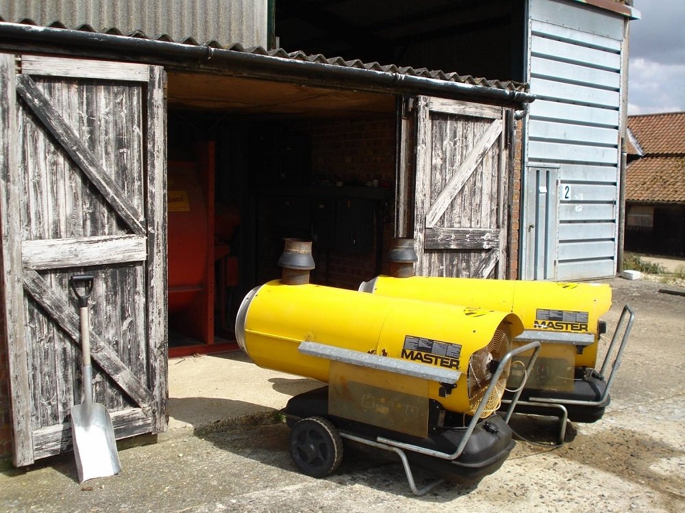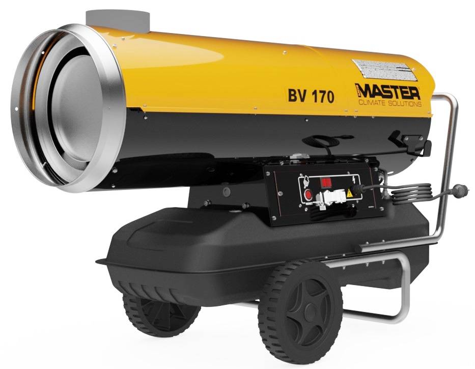 Mobilní naftové topidlo Master BV 170 E s nepřímým spalováním a zabudovanou palivovou nádrží s výkonem 47 kW a průtokem vzduchu 1.800 m³/h.
