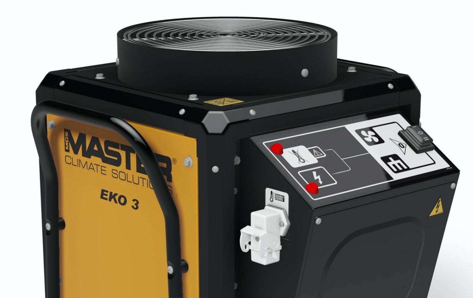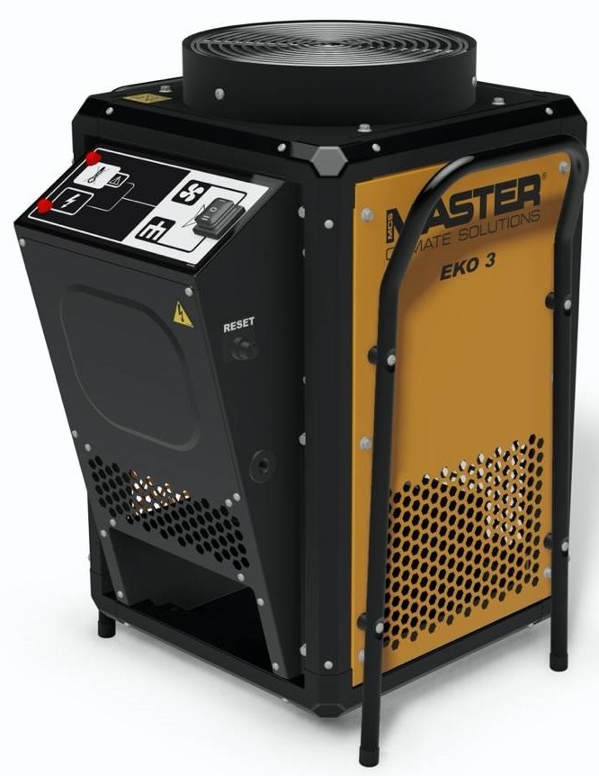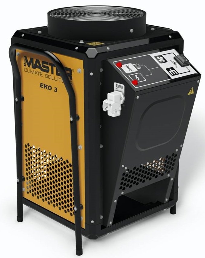 Kompaktní a lehký (19 kg) EKO 3 dodává 800 m 3 / h horkého vzduchu při použití pouze 2,8 kW při 230V (jednofázová). Připojení k externímu digitálnímu dálkovému termostatu THK, který je specifický pro tuto aplikaci a je součástí balení. Motor s tepelnou ochranou. MASTER EKO 3 se umístí dovnitř místnosti a recirkuluje vzduch, čímž se současně zvyšuje teplota o 15 ° C.
