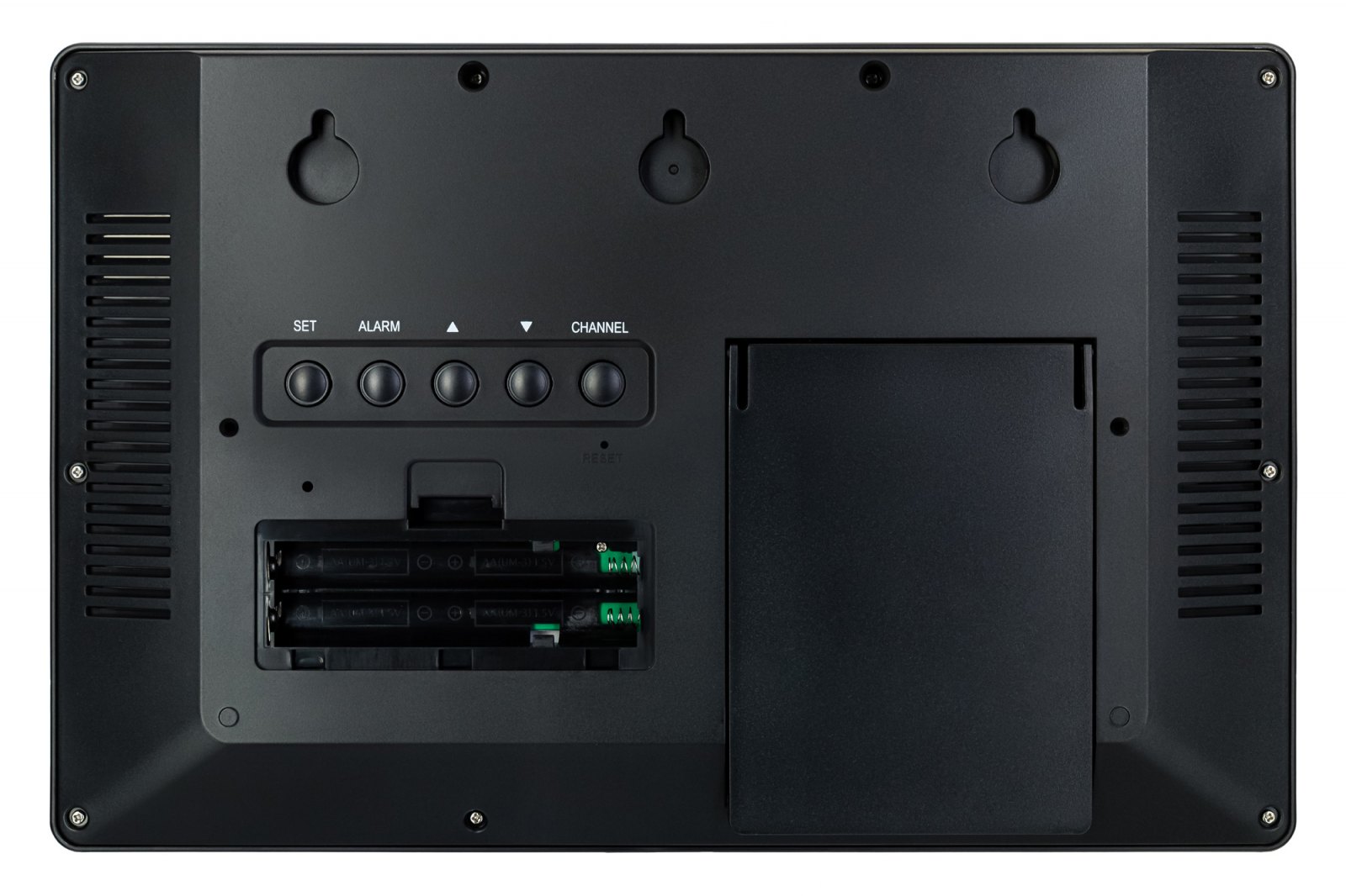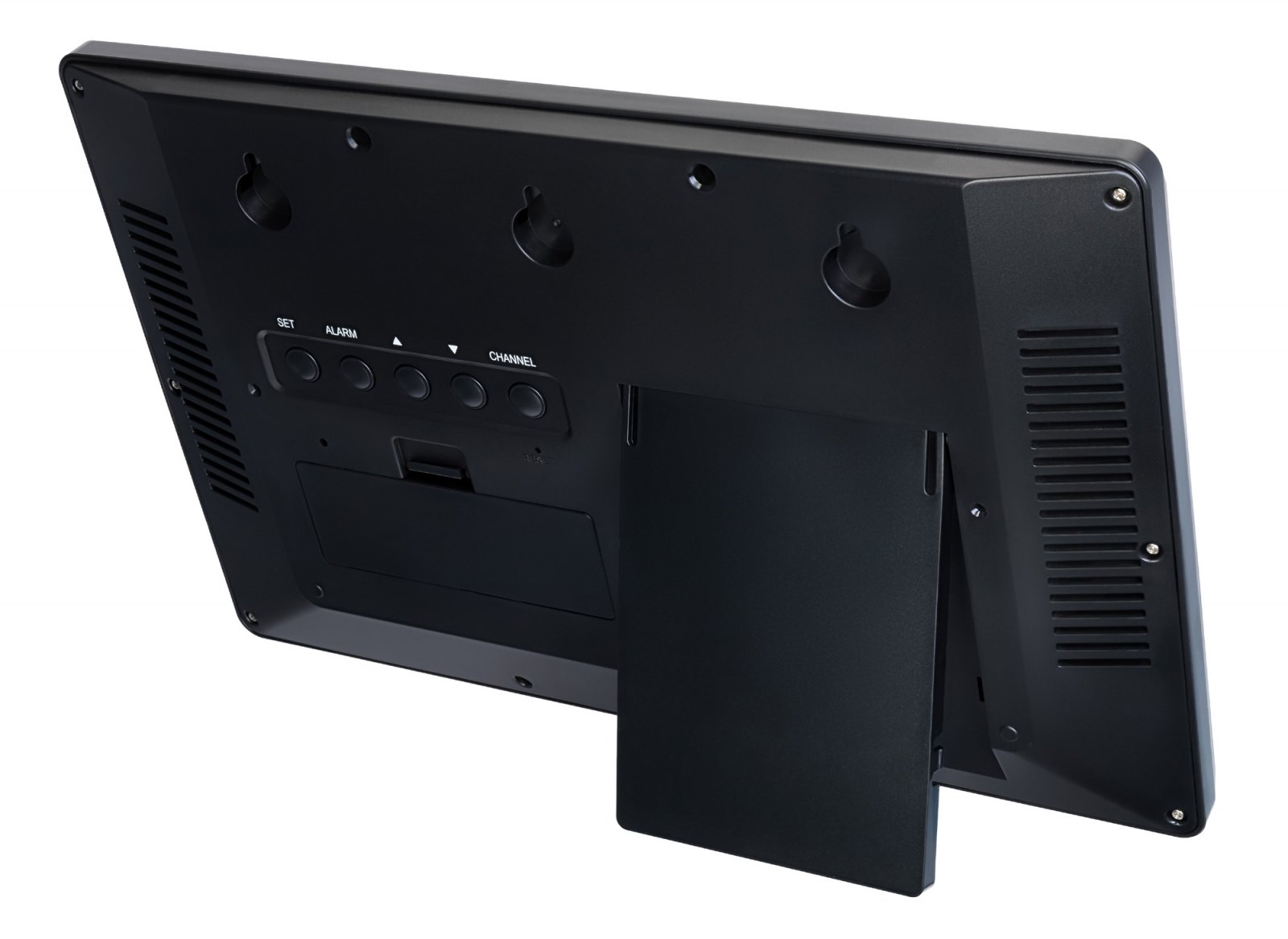 Přední panel obsahuje dvojici černobílých obrazovek. Horní je větší a používá se pro hodiny. Údaje jsou velké a jasné a číslice jsou dobře viditelné i z dálky. Spodní obrazovka je menší. Střední část je určena pro kalendář;levá a pravá část je určena pro měření teploměru a vlhkoměru uvnitř i venku. Ovládací tlačítka jsou umístěna na zadním krytu.