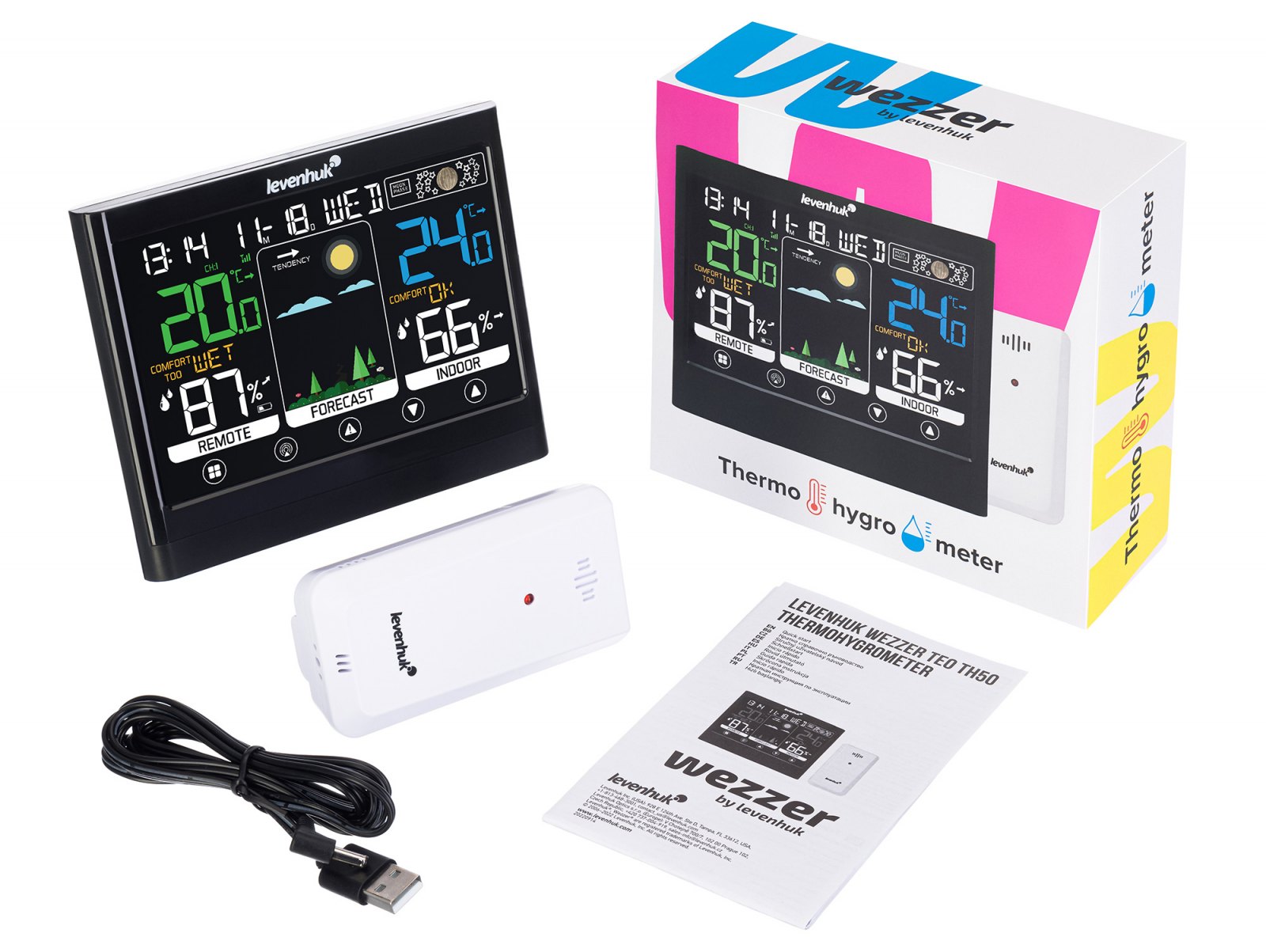 Levenhuk Wezzer Teo TH50 je termohygrometr s dotykovým ovládáním a senzorem dálkového ovládání, který je součástí dodávky. Jeho hlavní funkcí je informovat o teplotě a vlhkosti uvnitř i venku a vyhodnocovat tyto dva parametry pro kontrolu povětrnostních podmínek a hlášení negativních trendů. Každý ví, že extrémní výkyvy vlhkosti mohou zhoršit chronická onemocnění a příliš nízké nebo vysoké teploty mohou negativně ovlivnit zdraví – tyto parametry je třeba velmi pečlivě sledovat.