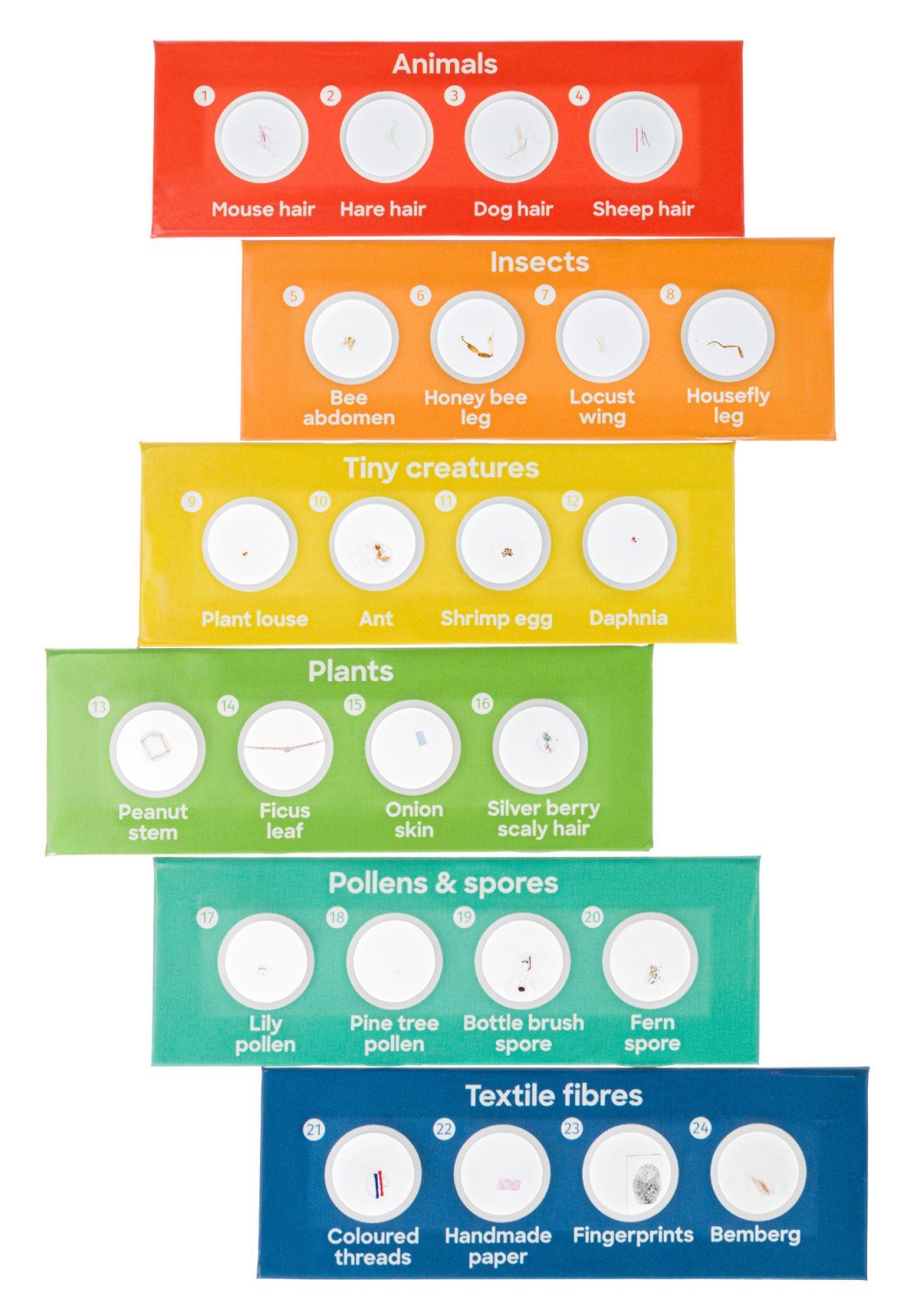 Důležitá informace k tomuto mikroskopu: je dodáván se sadou Discovery Flora a Fauna, která obsahuje 24 připravených sklíček s preparáty.
