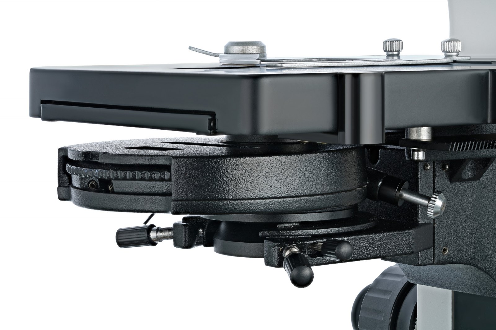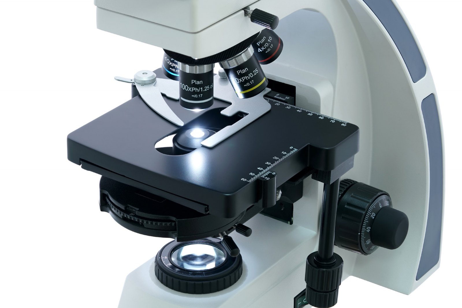 Stolek je vybaven mechanickou stupnicí. Stolkem lze pohybovat ve dvou směrech. Kondenzor fázového kontrastu se používá pouze pro pozorování „suchou“ metodou. Světlo se nachází ve spodní části. Jedná se o systém 5 W LED s nastavením jasu. Ostrost obrazu lze nastavit pomocí knoflíků pro hrubé a jemné zaostřování.