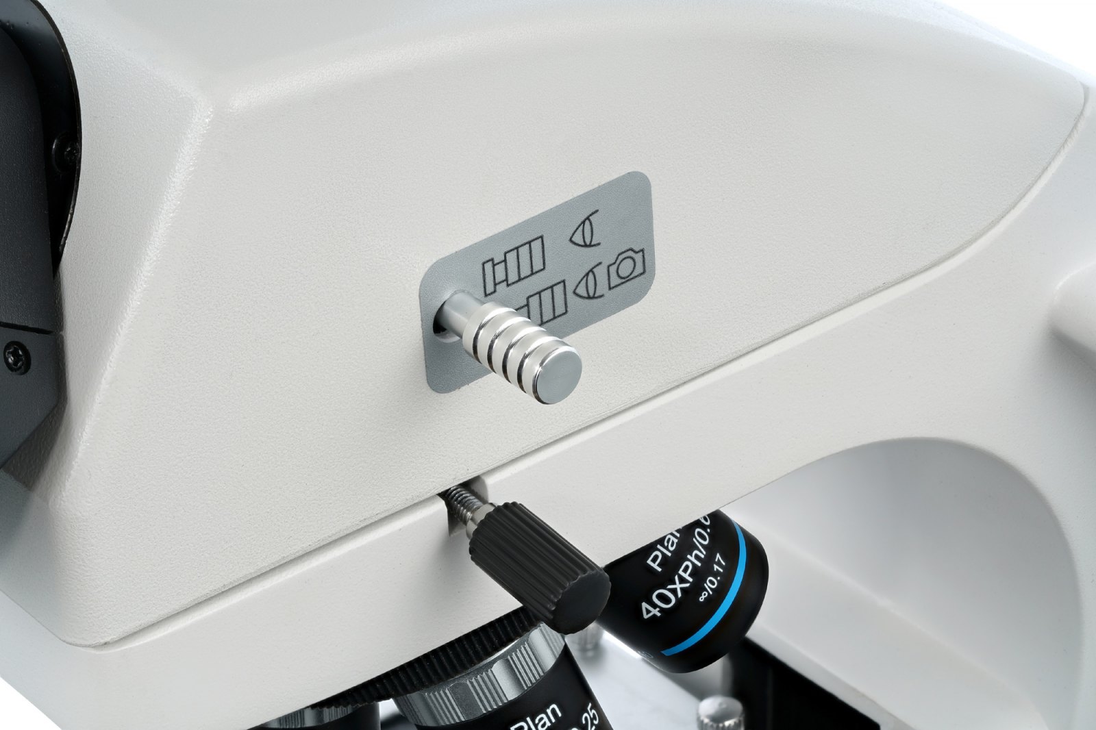 Revolverový nosič objektivů pojme pět objektivů;sada obsahuje čtyři rovinné achromatické objektivy s fázovým kontrastem s různým zvětšením. Objektivy s vysokým stupněm zvětšení mají pružinové okraje. Objektiv 100x se používá pro pozorování s imerzním olejem. Širokoúhlé okuláry umožňují práci s rozšířenými vzorky a nastavení dioptrií podle zrakových možností uživatele. Optický systém přenáší obraz s vysokým rozlišením a vysokým kontrastem, generuje ploché pole a minimalizuje chromatickou aberaci. Veškeré příslušenství je vyrobeno z optického skla s protiplísňovým povlakem.