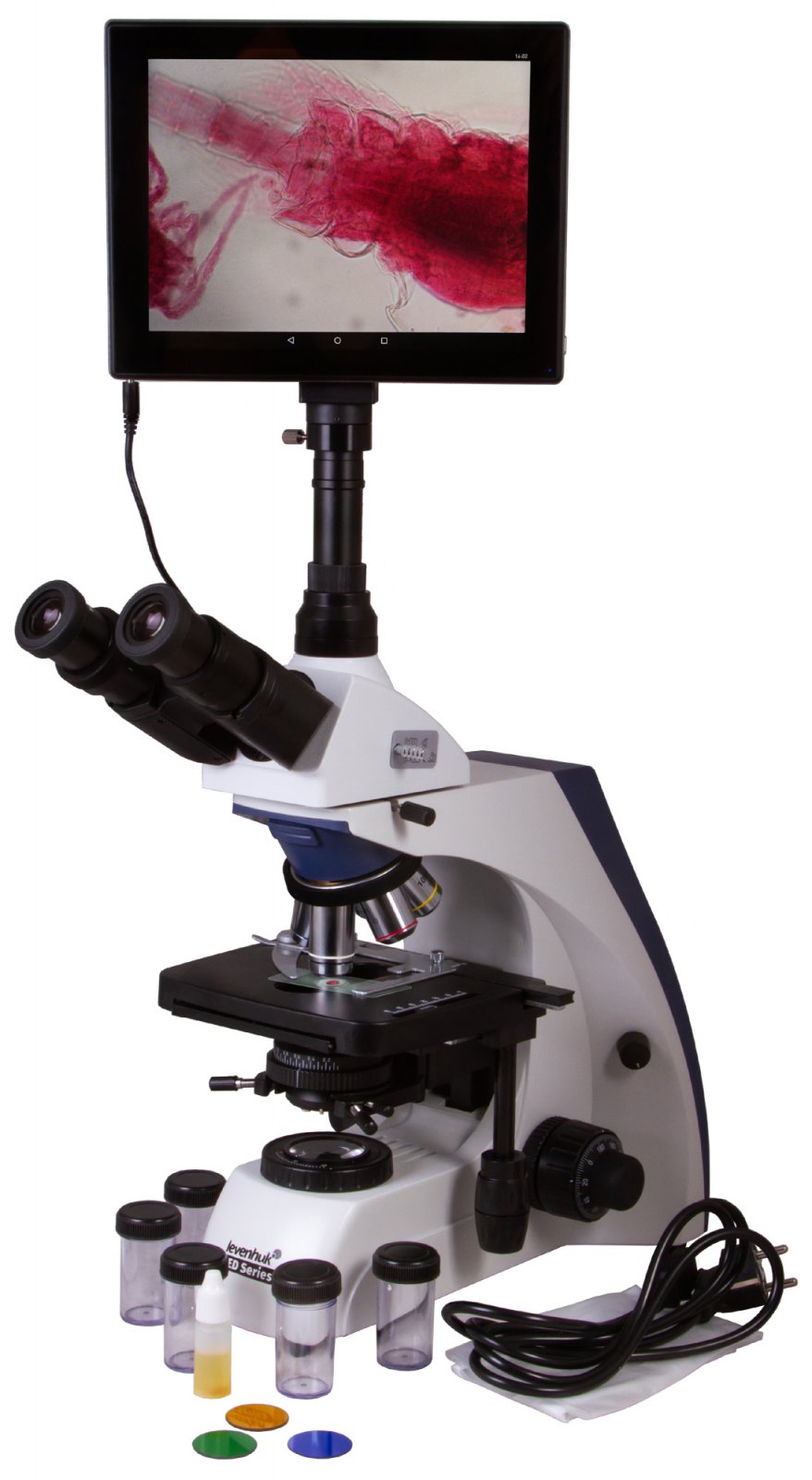 Trinokulární digitální mikroskop Levenhuk MED D35T LCD je určen pro profesionální mikro pozorování v medicíně, biochemii, klasické biologii a dalších vědních oborech. Je ideální volbou pro klinickou diagnostickou laboratoř nebo univerzitní oddělení. Mikroskop je dodáván s digitálním fotoaparátem s LCD obrazovkou, umožňuje nastavení Köhlerova osvětlení a podporuje imerzní olejovou metodu. Mikroskop používá rovinnou achromatickou optiku, která umožňuje provádět pozorování při zvětšeních 40x až 1000x.