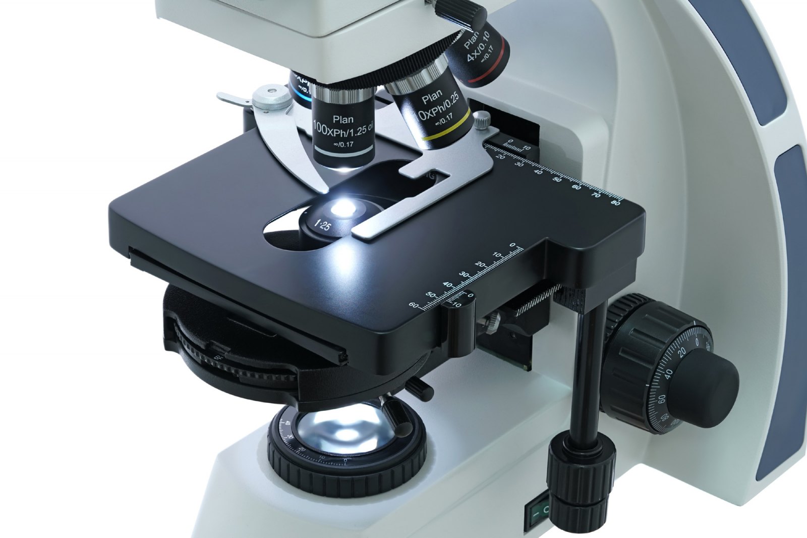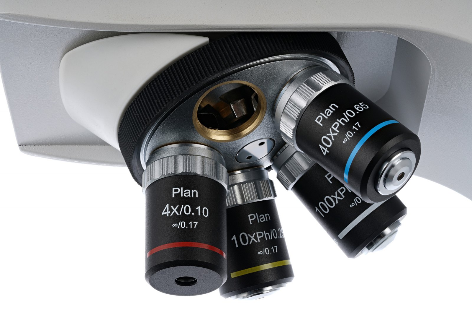 Součástí sady jsou i širokoúhlé 10x okuláry. Můžete nastavit dioptrie tak, aby odpovídaly vašemu zraku. K dispozici je hrubé i jemné nastavení ostrosti. Revolverový nosič pojme pět objektivů;sada však obsahuje pouze čtyři. Jsou to rovinné achromatické objektivy s fázovým kontrastem, které redukují optické zkreslení a zlepšují barvu a kontrast obrazu. Objektivy 40x a 100x obsahují pružinové okraje. Objektivy 100x lze použít pro pozorování s olejovou lázní. Veškerá optika je vyrobena z optického skla s protiplísňovým povlakem.