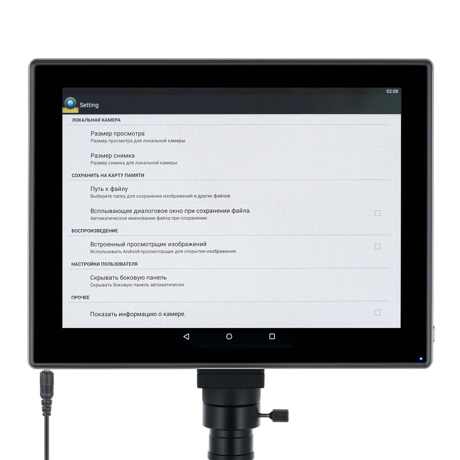 Trinokulární hlavice je rozdělena na binokulární vizuální modul a samostatnou okulárovou trubici pro umístění digitálního fotoaparátu. Fotoaparát je součástí sady; umožňuje pořizovat fotografie a videa ve vysokém rozlišení. Snímky z objektivu mikroskopu mohou být zobrazeny na vestavěné LCD obrazovce fotoaparátu nebo na připojené externí obrazovce nebo na televizoru. Instalace softwaru nebo ovladačů není nutná – fotoaparát začne pracovat ihned po připojení. K fotoaparátu lze připojit externí úložiště dat, sluchátka, myš a další příslušenství. Trinokulární hlavice se otáčí kolem své osy o 360° a vizuální část umožňuje pohodlný sklon pod úhlem 30°.