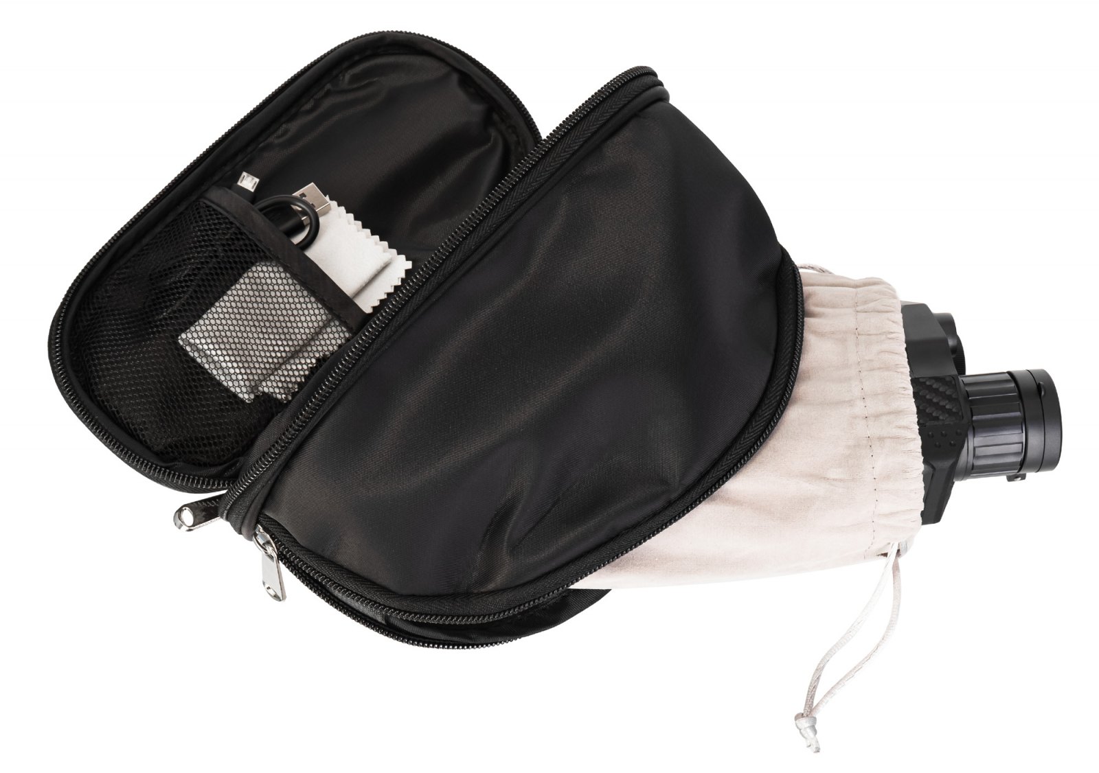 Lehké tělo monokulárního dalekohledu je vyrobeno z ABS plastu – materiálu, který je známý svou odolností vůči mechanickému namáhání. Přístroj se pohodlně drží v rukou a při přepravě nezabírá mnoho místa. Monokulární dalekohled je napájen vyměnitelnou dobíjecí baterií a doba provozu na jedno nabití trvá až 5 hodin (při vypnutém infračerveném osvětlení). Funkce automatického vypnutí displeje a přístroje vám výrazně pomůže šetřit energii baterie.