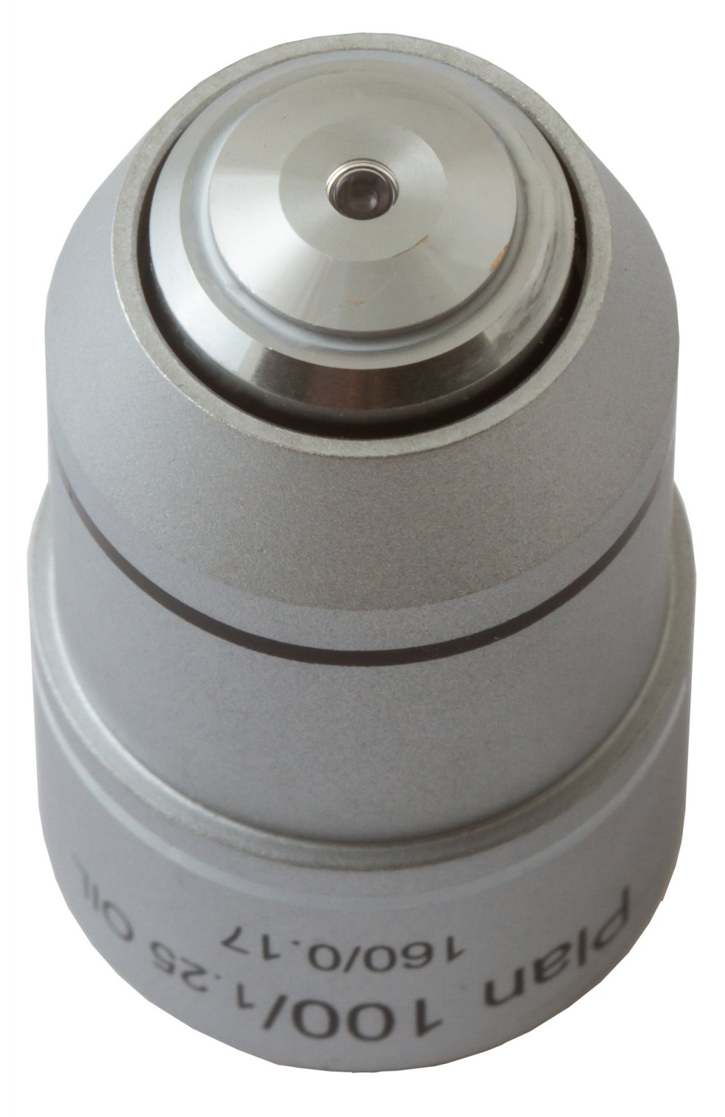 Rovinný achromatický objektiv Levenhuk MED 100x je vybaven skleněnou optikou a jeho konstrukce je kovová.