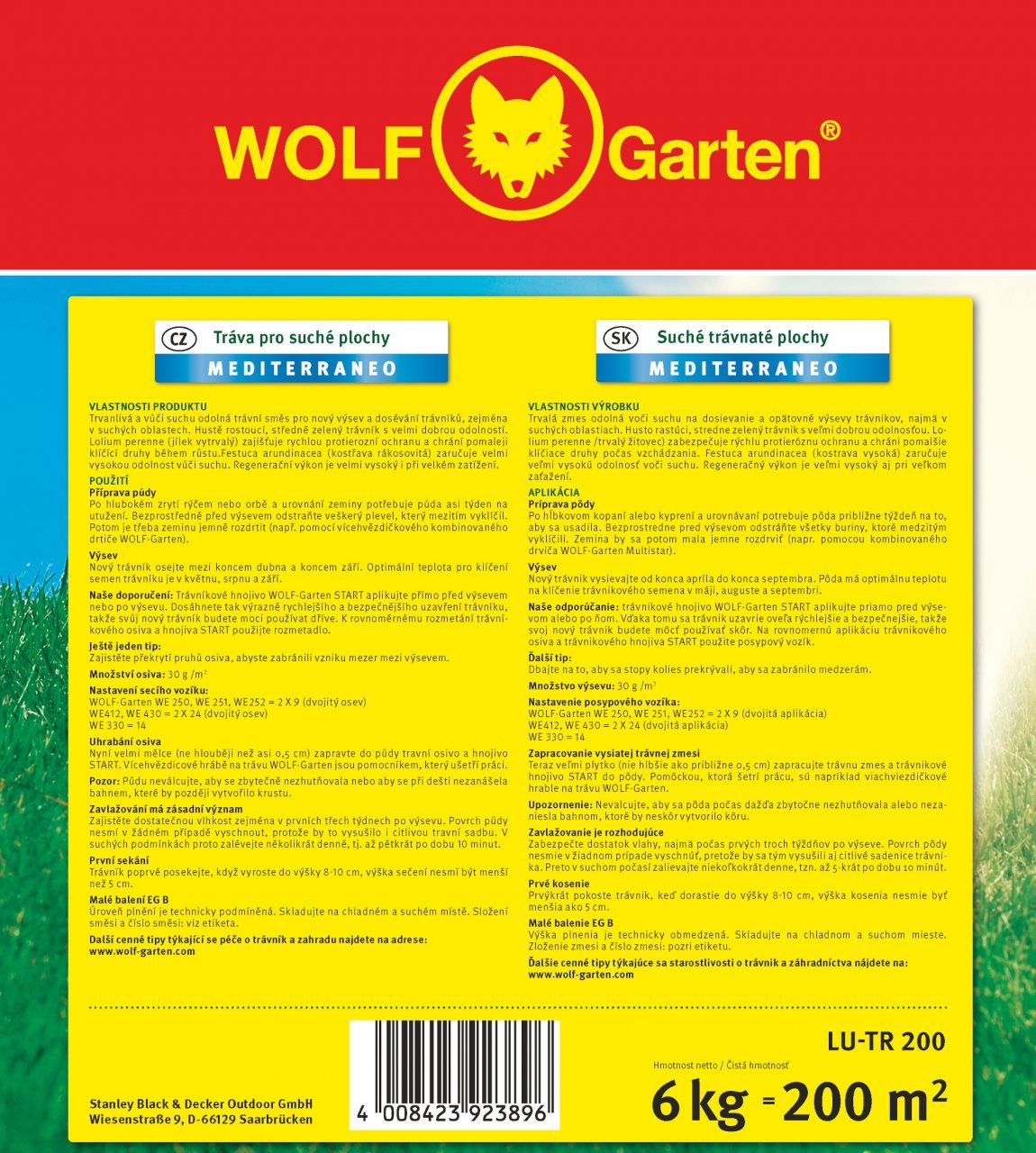 Doba použití; květen, srpen - září Doporučená plocha (m2);pro 200 m/6kg Trvanlivá a vůči suchu odolná travní směs pro nový výsev a dosévání trávníků, zejména v suchých oblastech.