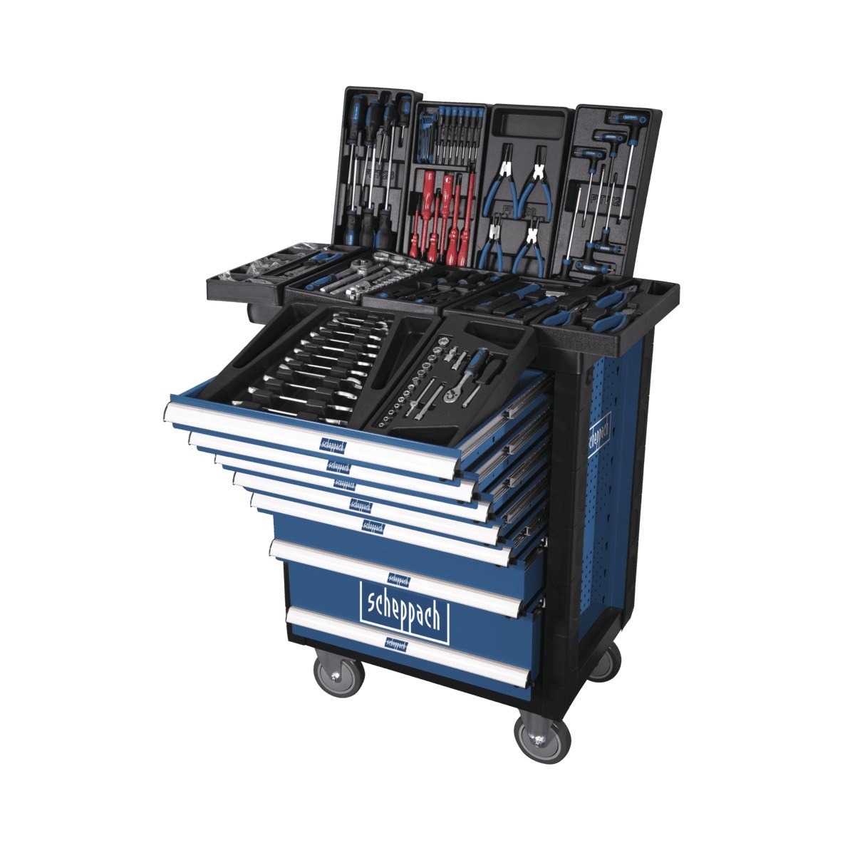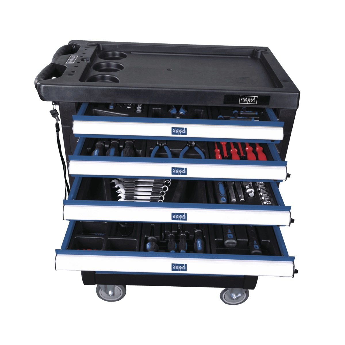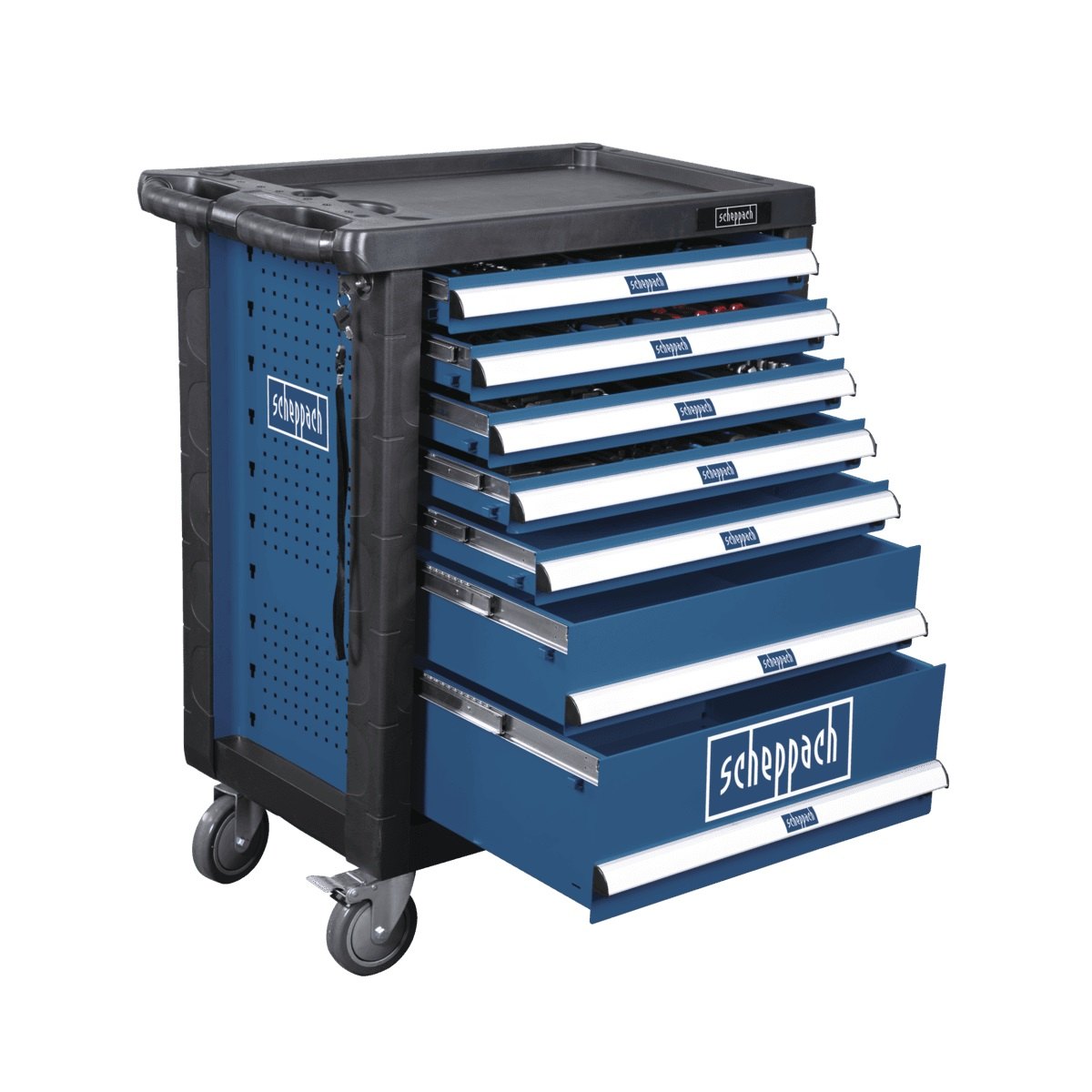 Samozřejmostí je mechanismus bránící jejich samovolnému otevření a rovněž zámek, který chrání obsah před přístupem nepovolaných osob. Boční stěny vozíku jsou vybaveny děrovanou deskou, na kterou lze navěsit další nářadí nebo vhodné držáky či poličky. Čtyři zásuvky jsou vybaveny kvalitním běžně používaným nářadím (gola sady, kleště, různé druhy šroubováků, kladiva, klíče, elektrikářské díly apod.), zbylé tři zásuvky si můžete dovybavit nářadím dle svých požadavků. Každý kus nářadí má přesně stanovené místo a bude tak vždy a rychle po ruce.