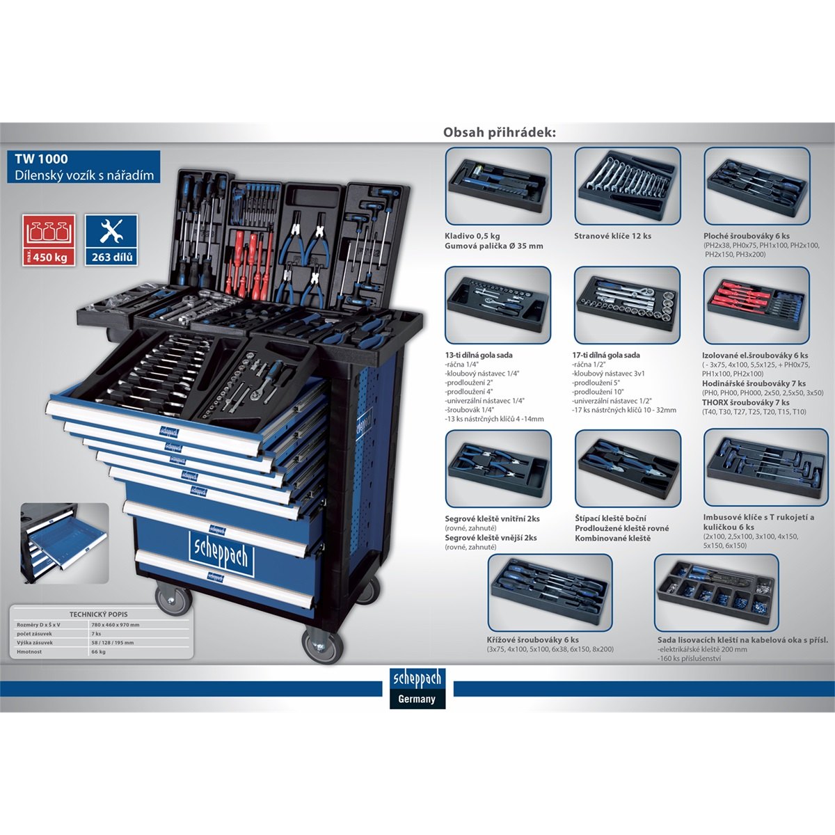 Scheppach TW 1000 je profesionální celokovový dílenský vozík vhodný do domácích i řemeslných dílen, garáží, servisů apod. Vyznačuje se velmi tuhou konstrukcí, opláštěním hran vozíku tvrzeným plastem, pracovní deskou z odolného plastu s prolisy pro uložení drobného materiálu a s nízkým ochranným lemem, který udrží vaše nářadí vždy na místě. Pro snadnou manipulaci s vozíkem slouží dvě transportní měkčená madla a čtyři velká kola. Ty jsou pogumovaná a dvě z nich jsou plně otočná s integrovanou brzdou. Špičkovou kvalitu poznáte i podle snadné manipulace se zásuvkami. Ty jsou vybaveny velmi robustními a kvalitními pojezdy, takže se s nimi snadno manipuluje i při plném zatížení.