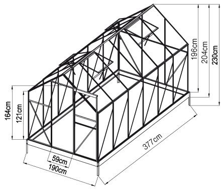 Hliníkový skleník VeGA 7000 STRONG. Součástí 4x střešní okno a 1x posuvné dveře. Speciální drážková konstrukce skleníku. Použito velice kvalitních tepelně-izolačních dvoustěnných komůrkových polykarbonátových desek. Rozměr skledníku š 190 x d 377 x v 204 cm.