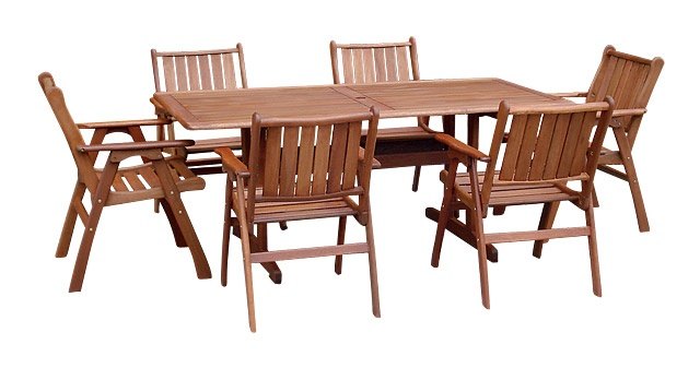 Masivní stolová sestava MERANTI VICTORIA SET 6, která obsahuje 6 křesel a stůl. Vyrobeno z odolného tropického dřeva Meranti.