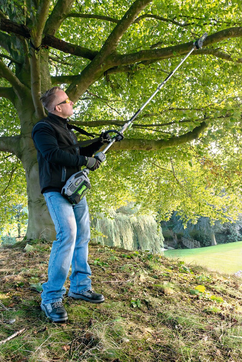 Pro zařezávání a odstraňování větví ve výšce koruny stromů je k dispozici 142 cm dlouhý nástavec s prořezávací řetězovou pilou s vodící lištou 25 cm. Jako řezný nástroj zde slouží řetízek 90PX 3/8"-1,1 - 40 článků. Výkon a stabilní kroutící moment 56V, bezuhlíkového elektromotoru v pohonné jednotce bohatě pokrývá požadavky řezného výkonu řetězové pily s délkou vodící lišty 25 cm. Řezná rychlost řetězu stačí na úpravu, odstraňování či zarovnávání větví koruny stromů bez potřeby žebříku či podobných zařízení při bezpečném a stabilním postoji přímo ze země. Rozšíření dosahu pily do ještě větší výšky získáte při použití prodlužovacího nástavce EP7501 z uhlíkových vláken v délce 78cm.