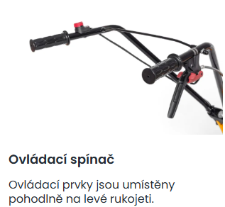 Rotační kultivátor se zážehovým motorem o zdvihovém objemu 123 ccm, s pracovní šířkou 36 cm a hloubkou 12 cm, který je vybaven 4 kovovými rotory a 1 předním transportním kole.
