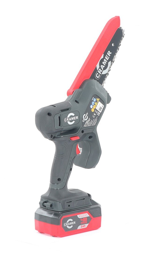 • Bezpečnost je zaručena díky spuštění dvěma tlačítky a krytu řetězu a baterie je zaměnitelná se všemi ostatními nářadími Cramer 48V.