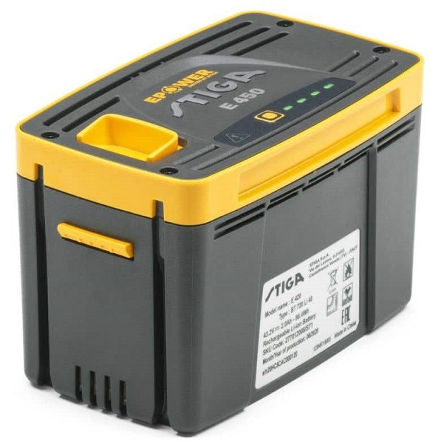 Baterie STIGA E 450 vhodná pro AKU zahradní techniku. Kapacita 5,0 Ah, napětí 48 V a hmotnost 0,9 kg. Doba nabíjení 2 hodiny.