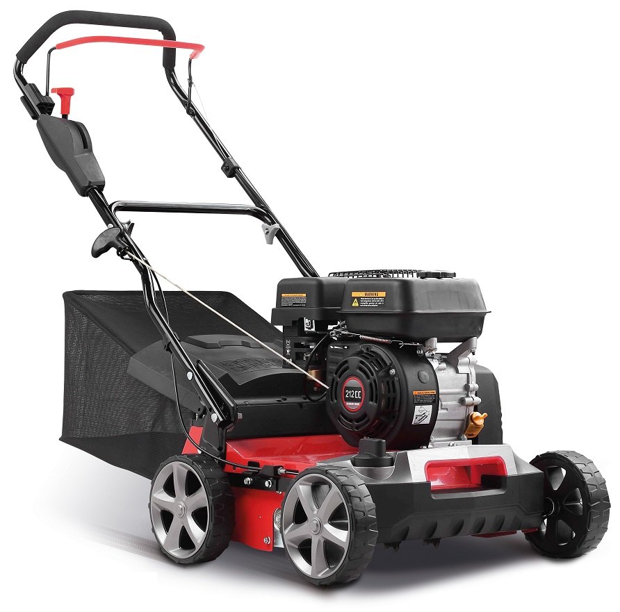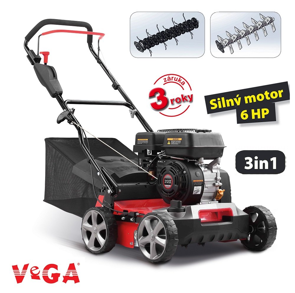 Motorový provzdušňovač trávníků VeGA TS40-W 3in1 s motorem VeGA 6HP o objemu 212 ccm, šířka pracovního záběru je 400 mm, plynulé centrální nastavením výšky, šasi je z oceli, sběrný koš o objemu 45l.