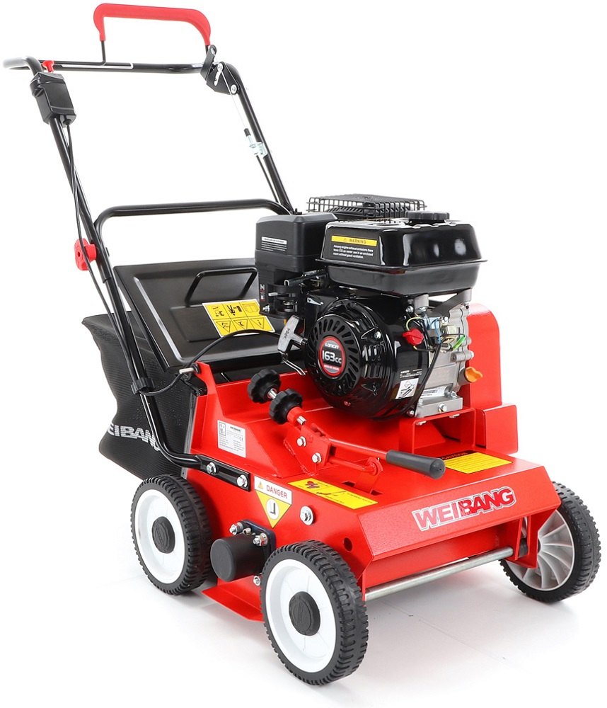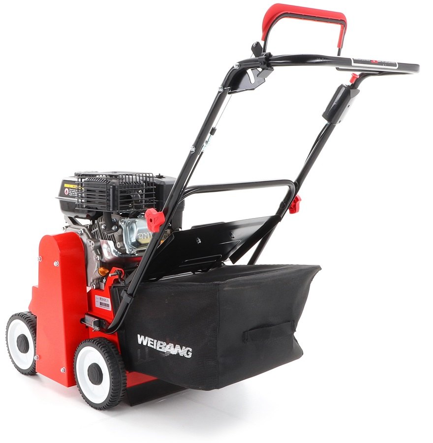 Motorový provzdušňovač trávníků WEIBANG 384 RC s motorem Loncin OHV 163 ccm, 5Hp, šířka pracovního záběru je 380 mm, plynulé centrální nastavením výšky, robustní šasi z vysokojakostní oceli, sběrný koš o objemu 40l. Hřídel je osazena 22 profesionálními flexi noži - tato konstrukce eliminuje možné poškození nožů nebo celé hřídele. Hřídel je uložena v masivních ložiscích. Hmotnost provzdušňovače je 46 kg.