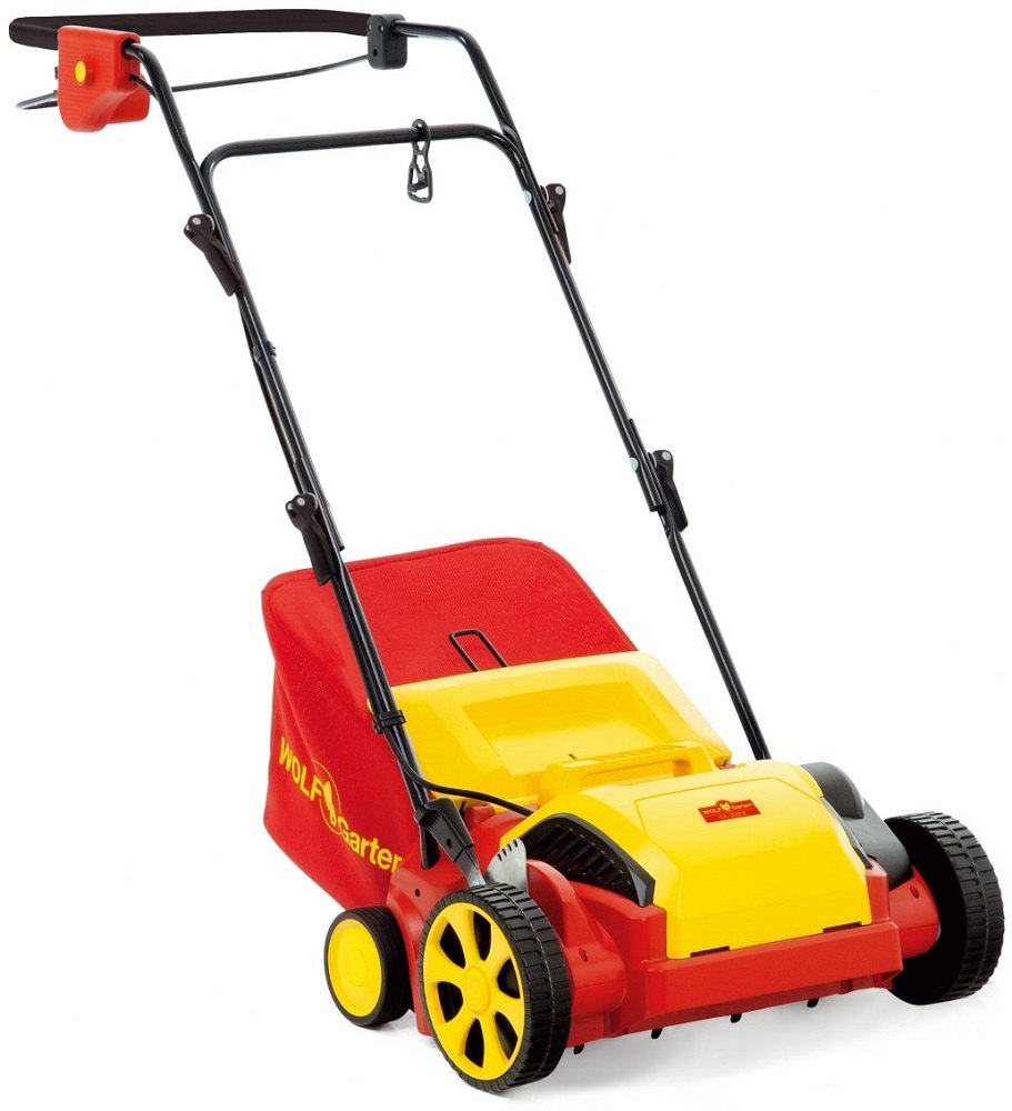 Elektrický vertikutátor Wolf-Garten VA 303 E s elektrickým motorem 230 V o výkonu 1300 W. Záběr 30 cm a sběrný koš 35 l. Hmotnost 12 kg.