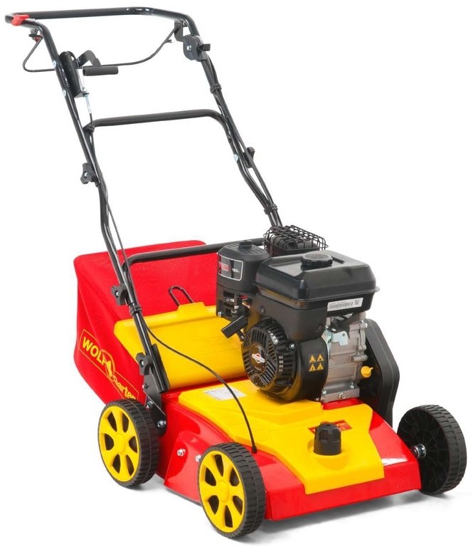 Benzinový vertikutátor Wolf-Garten VA 389 B. S motorem B&S série 750 o výkonu 3,4 kW, 163 cm3, 3 500/min. Se záběrem 38 cm. Kapacita sběrného koše je 50 l.